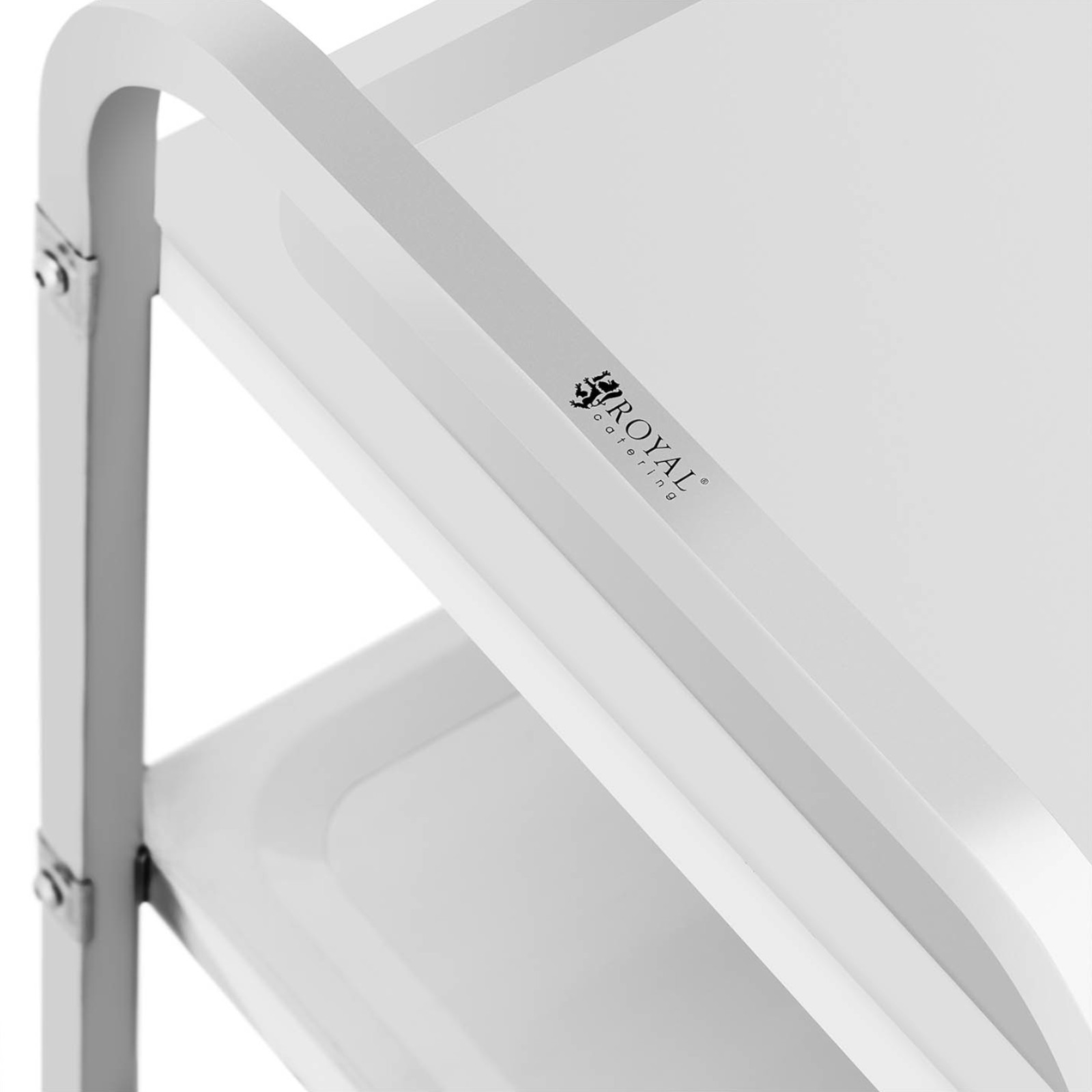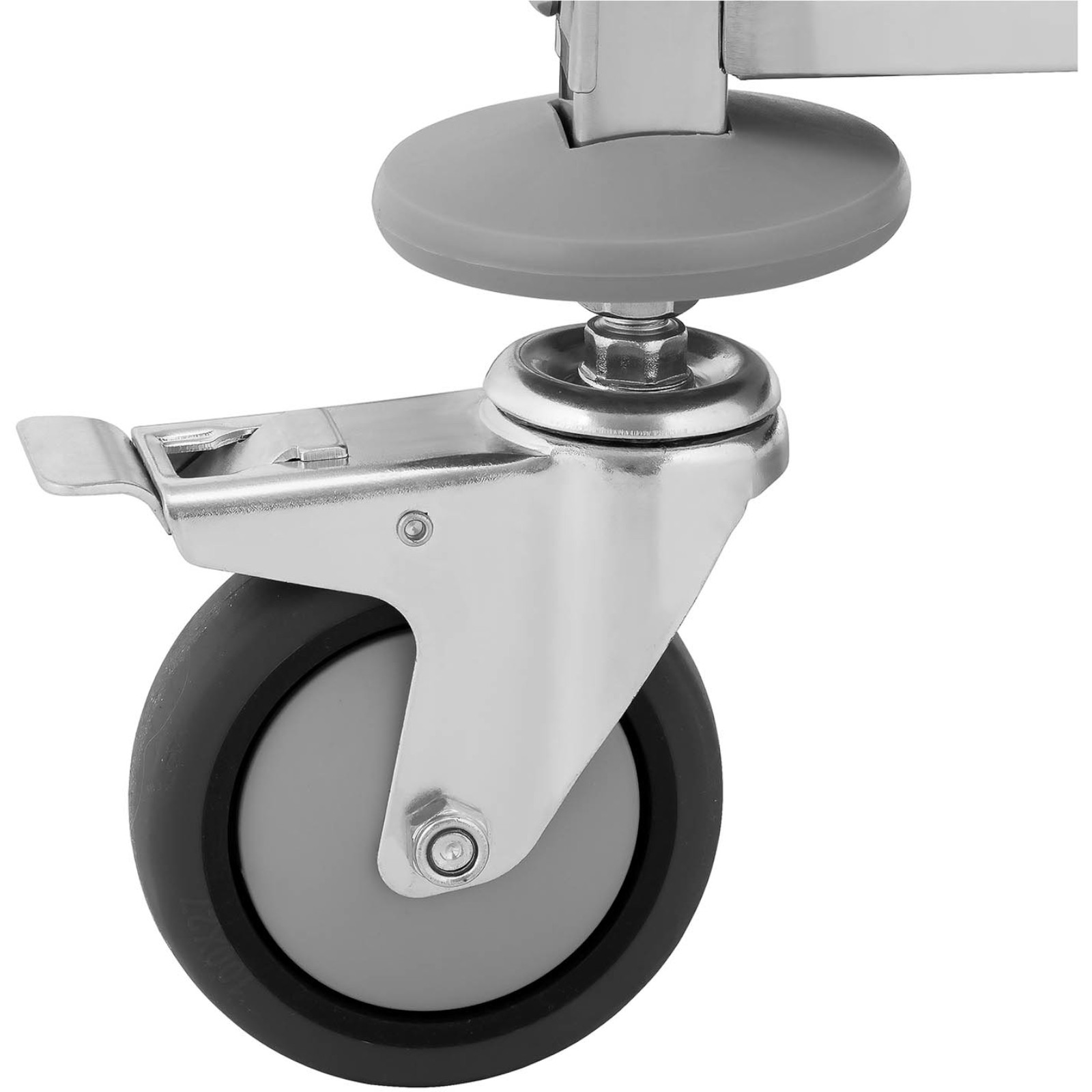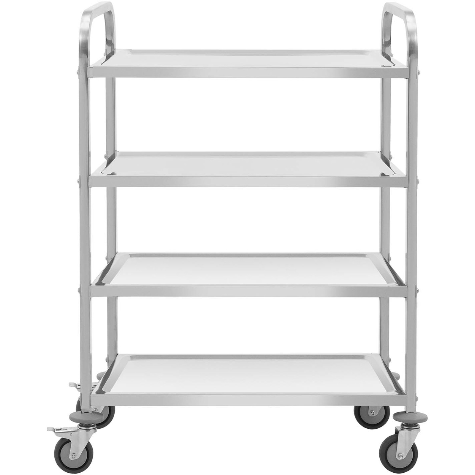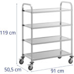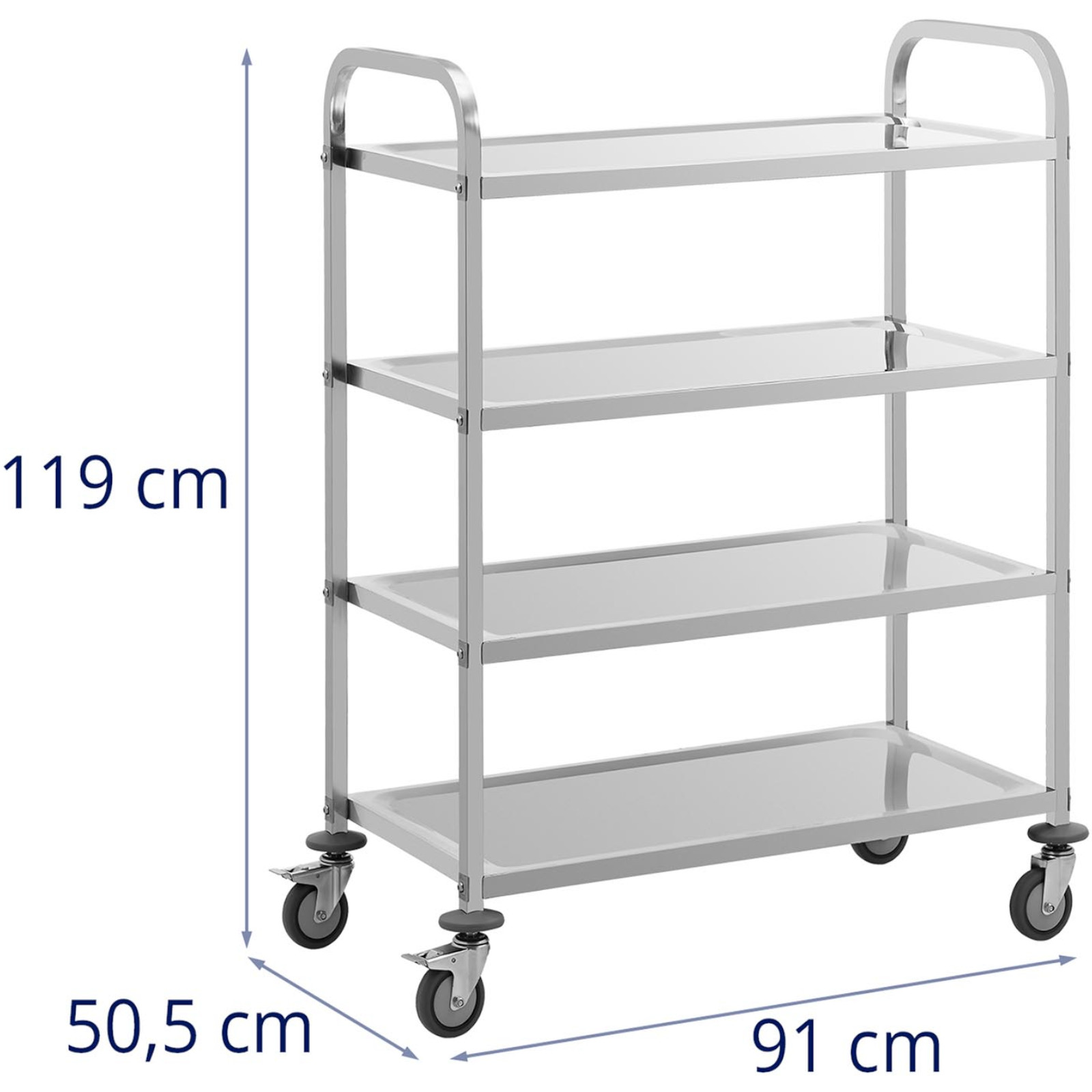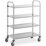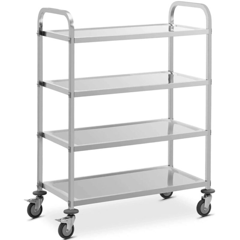 Wózek kelnerski marki Royal Catering posiada nośność do 144 kg. 4 płynnie obracające się kółka – w tym 2 z hamulcami pozwalają szybko i cicho przetransportować różne przedmioty. Łatwo dostępne 4 półki o wymiarach 73 x 38 x 3 cm oferują wystarczająco dużo miejsca na potrawy, wazy z zupami lub brudne naczynia. Wózek wykonany został z wysokiej jakości stali nierdzewnej. Kółka zrobiono z gumy termoplastycznej (TPR). Produkt jest odporny na czynniki zewnętrzne i łatwy w czyszczeniu.