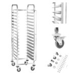 Wózek transportowy od Royal Catering stworzono z myślą o intensywnym użytku w restauracjach, hotelach, pensjonatach, ośrodkach wypoczynkowych, centrach konferencyjnych, barach fast food, bistro itp. RCTW-16TB.1 wyposażony został w prowadnicę na 16 tac o wymiarach 60 x 40 cm. Trwałość produktu jest zasługą konstrukcji ze stali szlachetnej, z której go wykonano. Dzięki 4 skrętnym kółkom z TPR wyposażonym w hamulce jest bardzo zwrotny i bezpieczny dla wszystkich rodzajów podłogi. Ochronę stanowią też gumowe odbojniki.