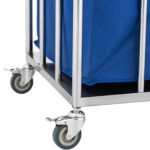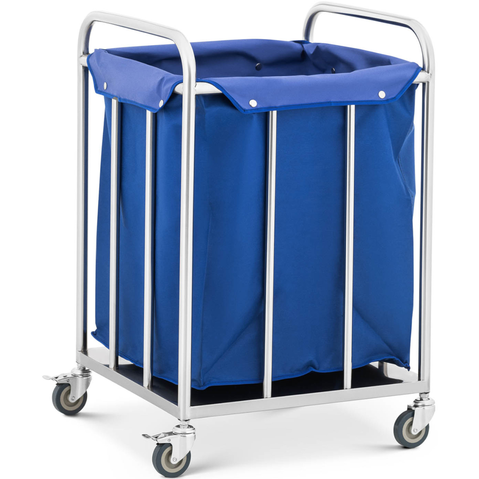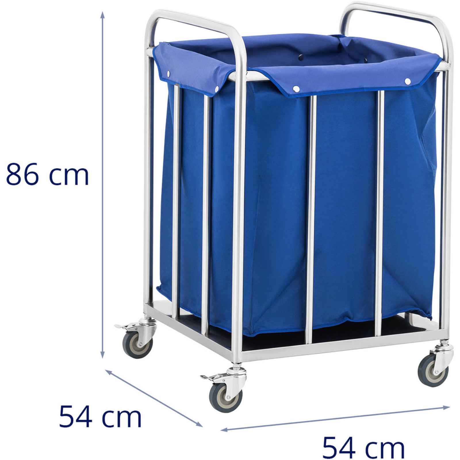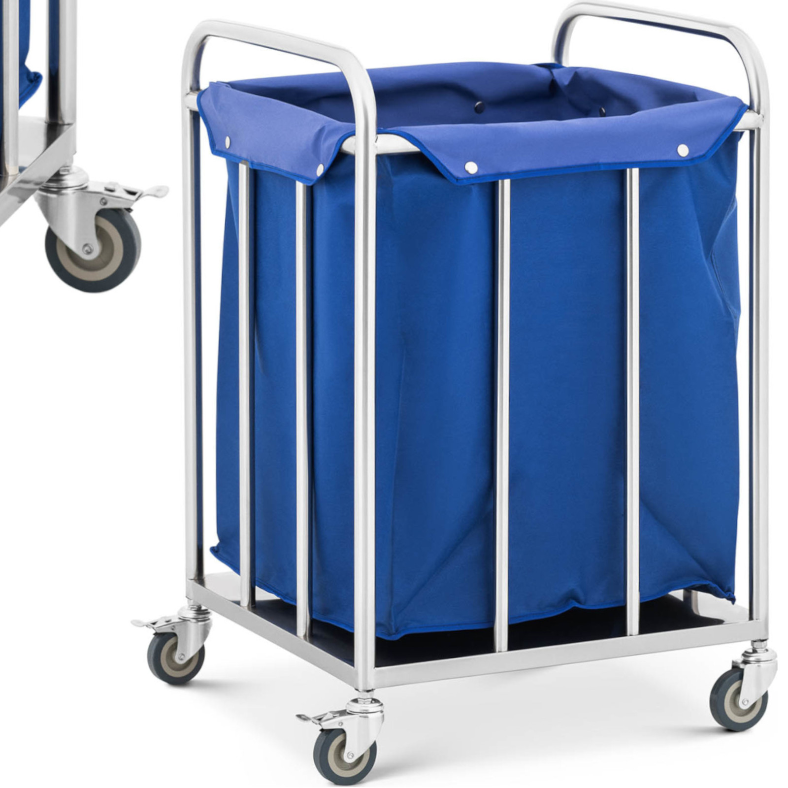 Wózek na pranie marki Steinberg Systems sprawdzi się w hotelach, pensjonatach, placówkach opiekuńczych, szpitalach itp. Udźwig wózka wynosi 60 kg a jego wymiary 57 x 57 x 86 cm. Wykonany został z wysokiej jakości stali nierdzewnej, jest trwały oraz łatwy w czyszczeniu. Torba wykonana została z wodoodpornej i wytrzymałej tkaniny oxford. Zapięcie na zatrzaski pozwala na szybkie i łatwe wyjęcie oraz ponowne zamocowanie worka na pranie. Cztery płynnie poruszające się kółka PVC zapewniają wygodny i bezpieczny transport. Podwyższone uchwyty boczne ułatwiają manewrowanie wózkiem.