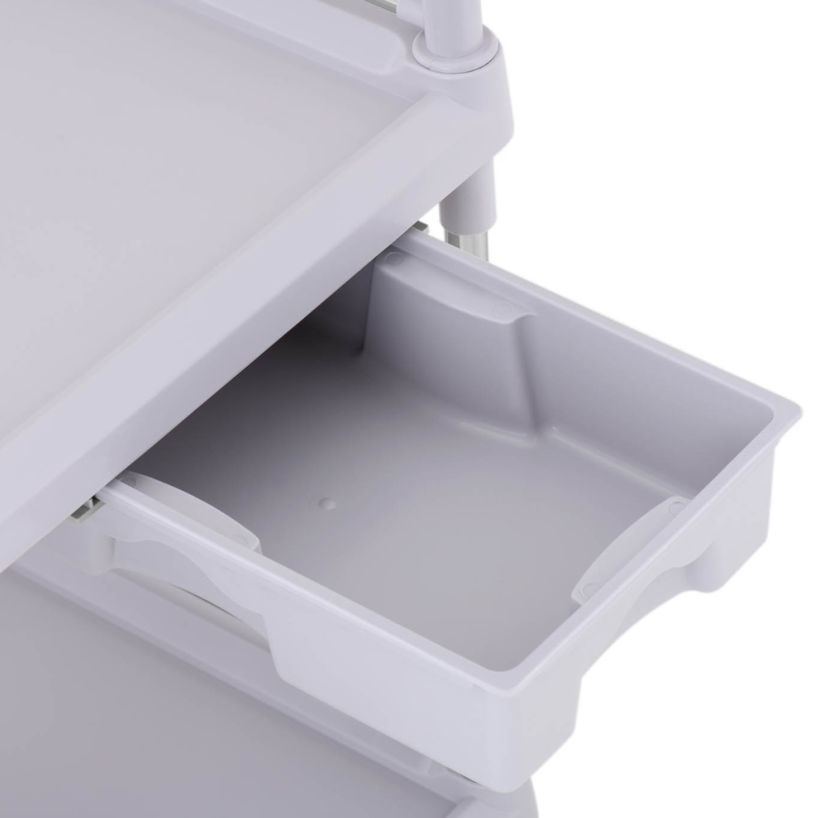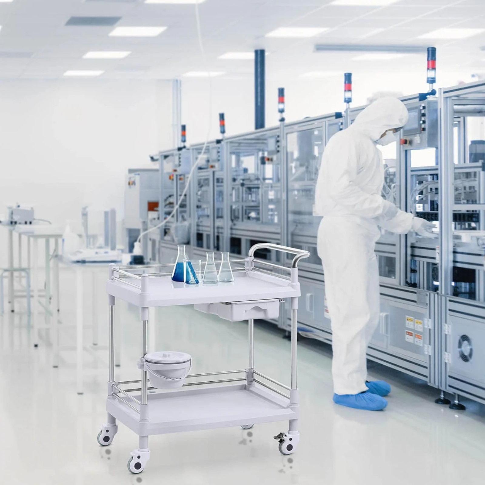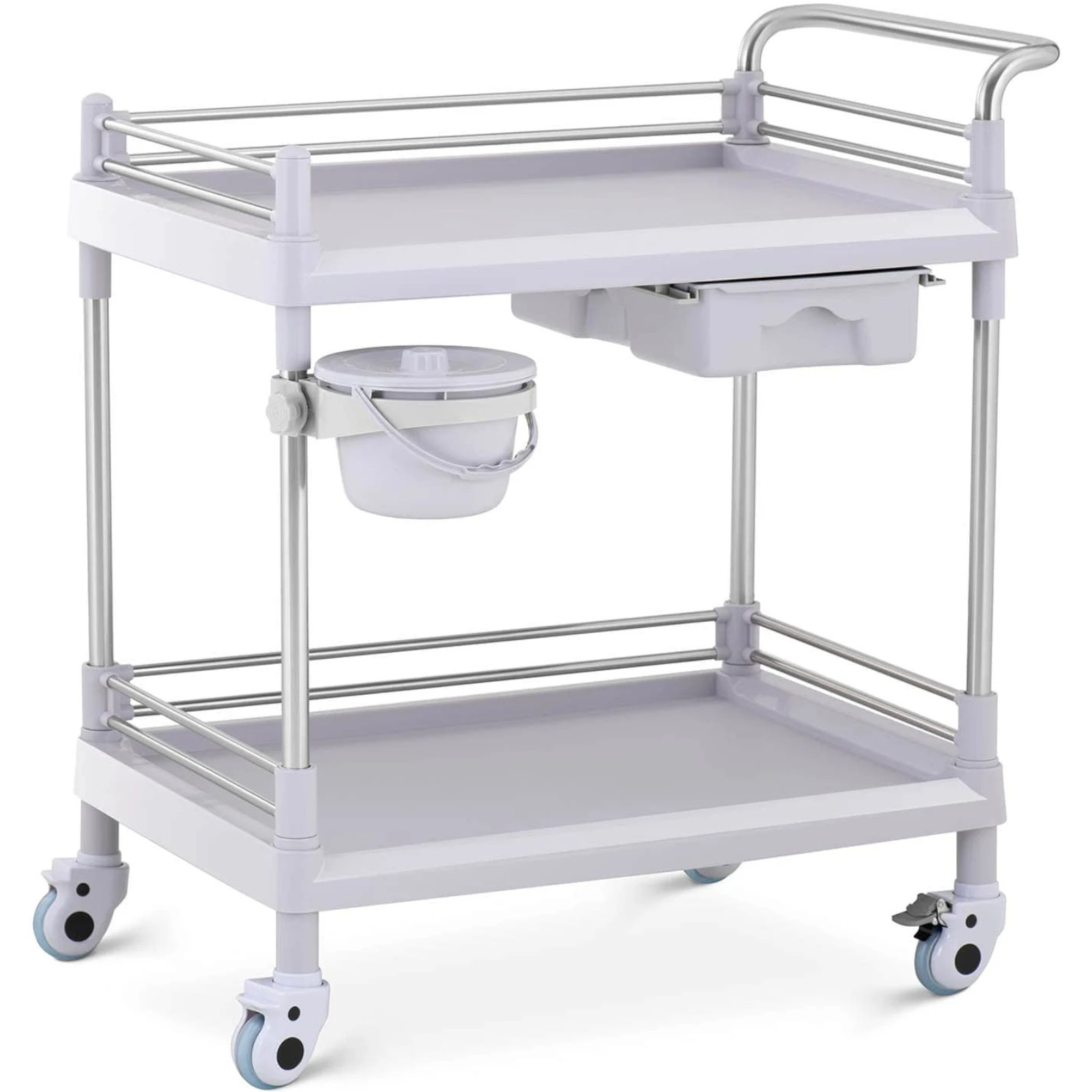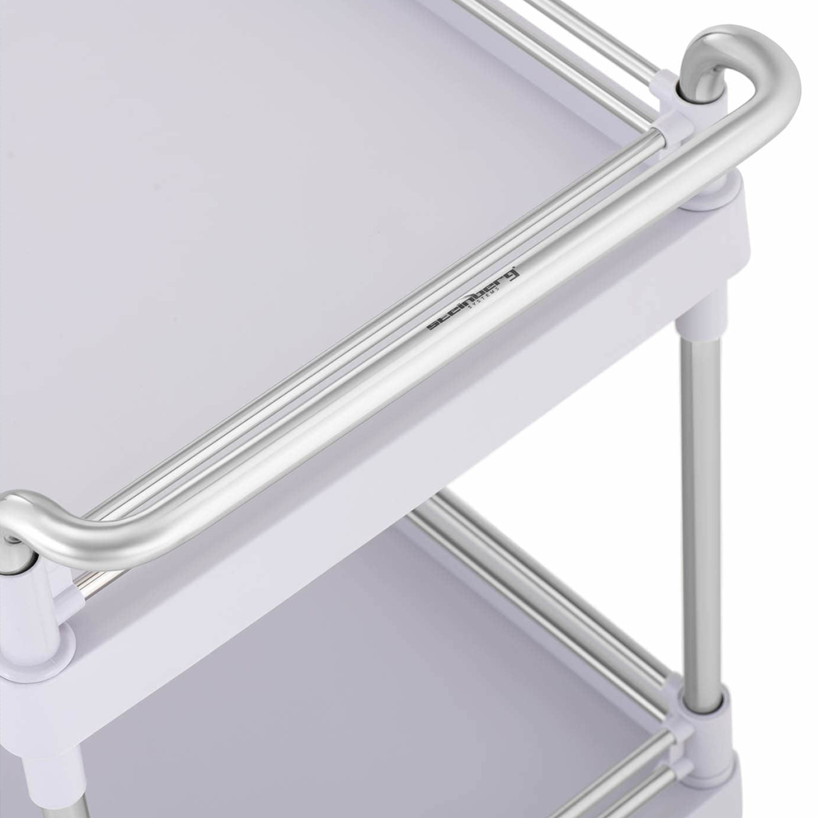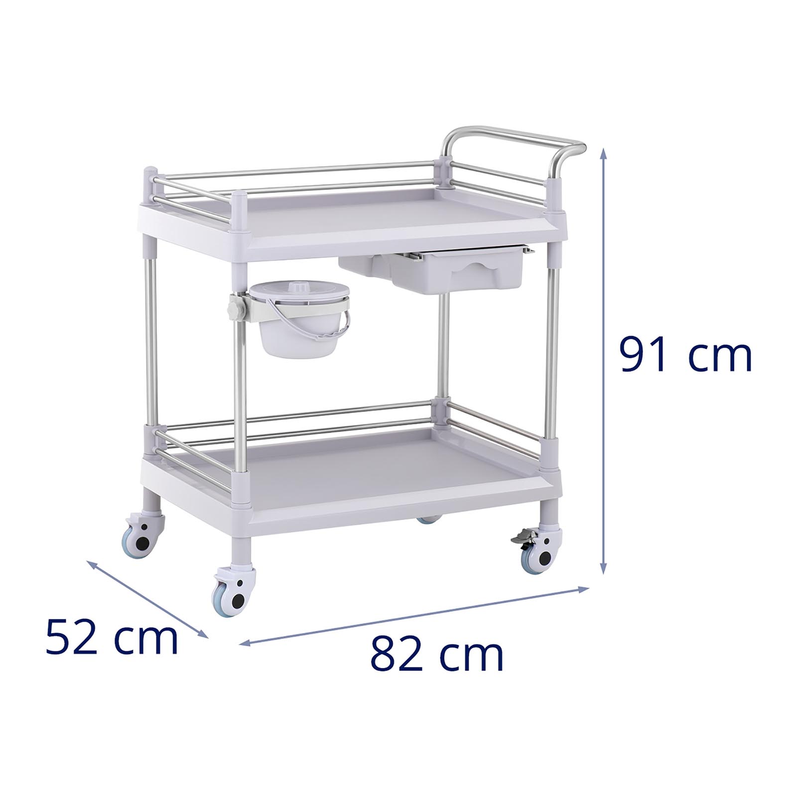 Wózek laboratoryjny marki Steinberg Systems pozwala wygodnie przechowywać i przewozić akcesoria takie jak statywy, probówki, płyny czy ręczniki. 2 półki o wymiarach 65 x 46 x 14 cm posiadają ramkę z 3 stron, chroniącą przed wypadnięciem. Jednocześnie jedna strona jest otwarta, co ułatwia wyjmowanie i układanie. Wózek posiada także szufladę o wymiarach 18 x 35 x 8 cm oraz kosz na śmieci obracany o 360° w zależności od potrzeb. 4 kółka oraz poręczny uchwyt pozwalają na szybki i łatwy transport wózka w wybrane miejsce. Koła wykonane zostały z plastiku (ABS+PCV), nie rysują podłogi, dwa hamulce postojowe zapewniają stabilność wózka. Rurki wykonano ze stali nierdzewnej a półki z tworzywa sztucznego. Nośność wózka wynosi 20 kg. Zastosowane materiały są łatwe w pielęgnacji i wyjątkowo trwałe.
