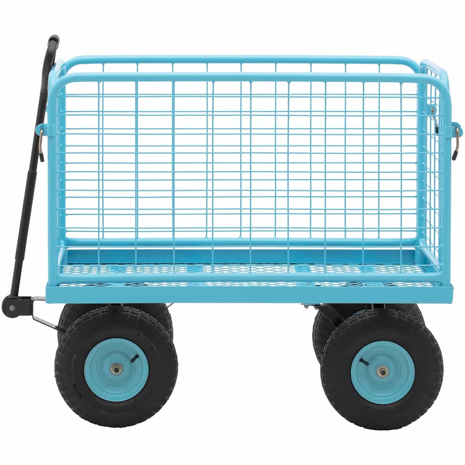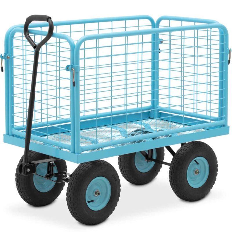 Składany wózek transportowy marki Hillvert sprawdzi się w magazynach, ogrodach lub w rolnictwie. Zdejmowane boczne barierki umożliwiają przewożenie dużych lub małych przedmiotów. Stabilna konstrukcja wyróżnia się wysoką nośnością do 400 kg. Przechylany dyszel o 150° zapewnia optymalną zwrotność nawet przy pełnym obciążeniu. Uchwyt jest wyściełany pianką NBR dla wygody użytkowania. Dodatkowo duże koła pneumatyczne radzą sobie na nierównych lub błotnistych powierzchniach. Stalową ramę przed korozją i czynnikami zewnętrznymi chroni niebieska powłoka proszkowa.