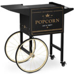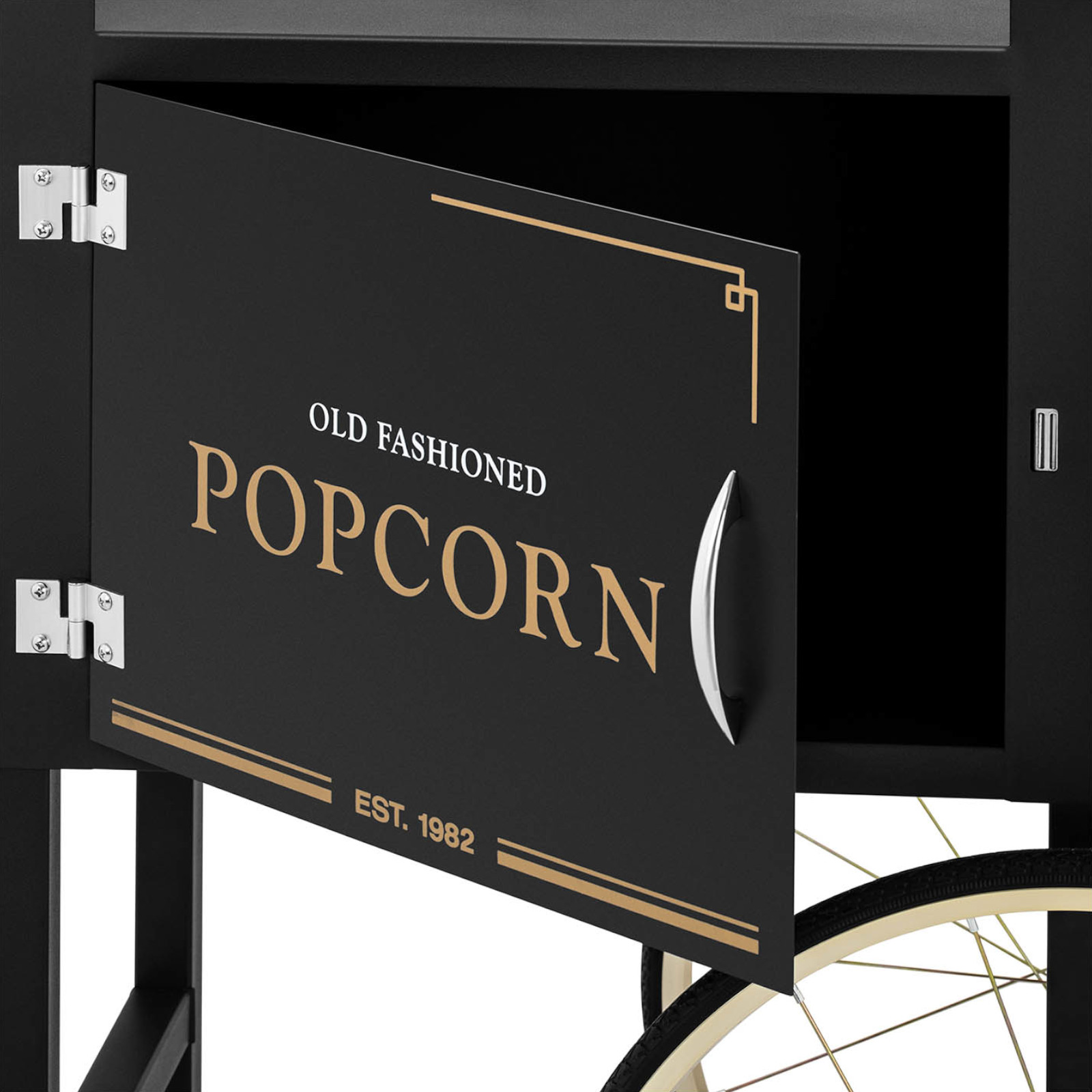 Wózek marki Royal Catering idealnie sprawdzi się w bufecie z przekąskami, kinie, na stoisku przy plaży lub w parku do ustawienia maszyny do popcornu. Na podstawie można ustawić maszynę do popcornu tego samego producenta, która stworzy spójną całość lub maszyny innych producentów. Obszerny górny blat o wymiarach 51 x 37 cm posiada na brzegach zabezpieczenie utrzymujące maszynę na miejscu. Szafka przyda się do przechowywania potrzebnych akcesoriów, ziarna, toreb itp. Półka boczna dodatkowo pomieści przydatne przedmioty. 4 koła zapewniają podstawie mobilność, 2 małe są skrętne i posiadają hamulce. Wygodny uchwyt pomaga w sterowaniu wózkiem. Konstrukcja wykonana została z blachy stalowej pomalowanej na atrakcyjny kolor. Wzornictwo utrzymane zostało w stylu retro.