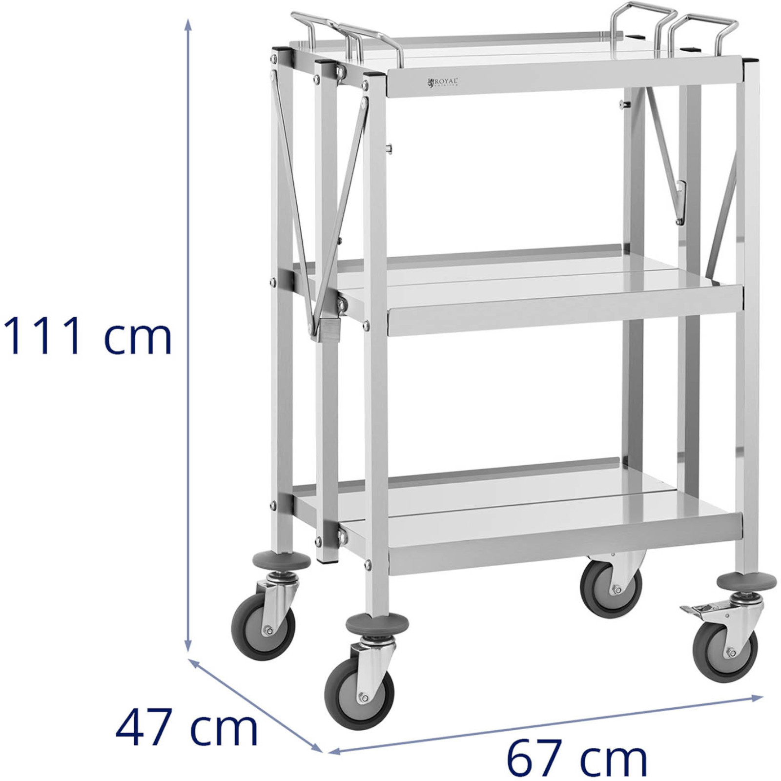 Wózek kelnerski marki Royal Catering wykonany został z wysokiej jakości stali nierdzewnej. Jego nośność wynosi 90 kg. Na 4 płynnie kręcących się kółkach, w tym 2 z hamulcami szybko i cicho przewieziesz jedzenie, napoje lub naczynia w wybrane miejsce na stołówce, w kuchni lub restauracji. Łatwo dostępne 3 półki o wymiarach 50 x 83 (2 szt.) / 40 x 58 cm oferują dużo miejsca do przechowywania akcesoriów. Składana konstrukcja pozwala na łatwy transport i przechowywanie. Kółka zrobiono z gumy termoplastycznej (TPR). Produkt jest odporny na czynniki zewnętrzne, a gładka powierzchnia jest łatwa w czyszczeniu.