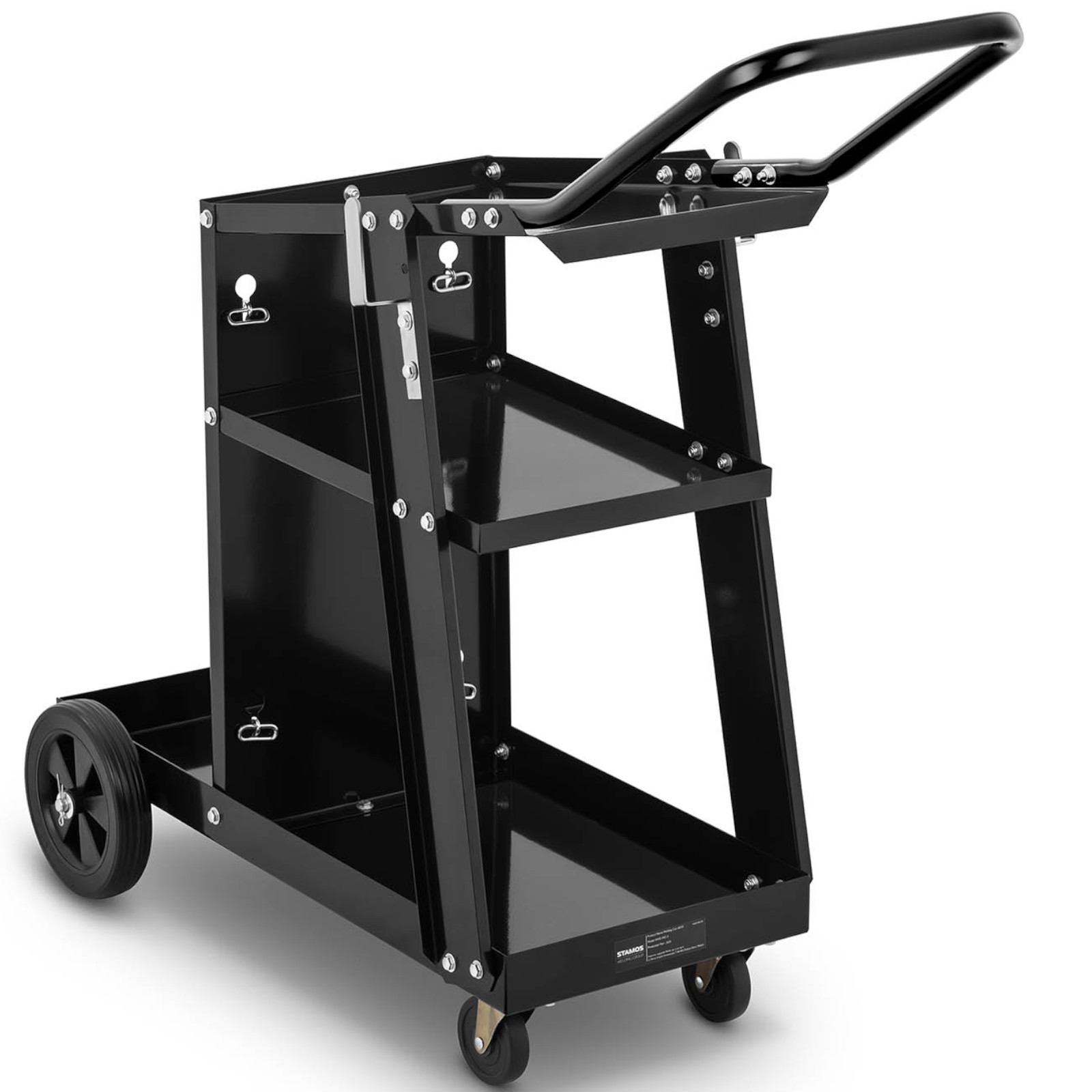 Wózek spawalniczy sprawdzi się do przechowywania sprzętów i narzędzi w branży spawalniczej oraz do ich wygodnego transportu. Wózek posiada 3 półki, jego maksymalna nośność wynosi 80 kg. Posiada także specjalną półkę na butlę z gazem oraz dwa metalowe łańcuchy do utrzymania jej w odpowiedniej pozycji. Po obu stronach umieszczone są uchwyty na przewody. 4 kółka zapewniają wózkowi mobilność. Para tylnych kółek o średnicy 190 mm jest wsparciem dla konstrukcji wózka, kółka przednie są mniejsze i skrętne (360 stopni). Wygodna rączka zapewnia sterowność. Konstrukcja sprzętu wykonana została z odpornej, pomalowanej na czarno stali.