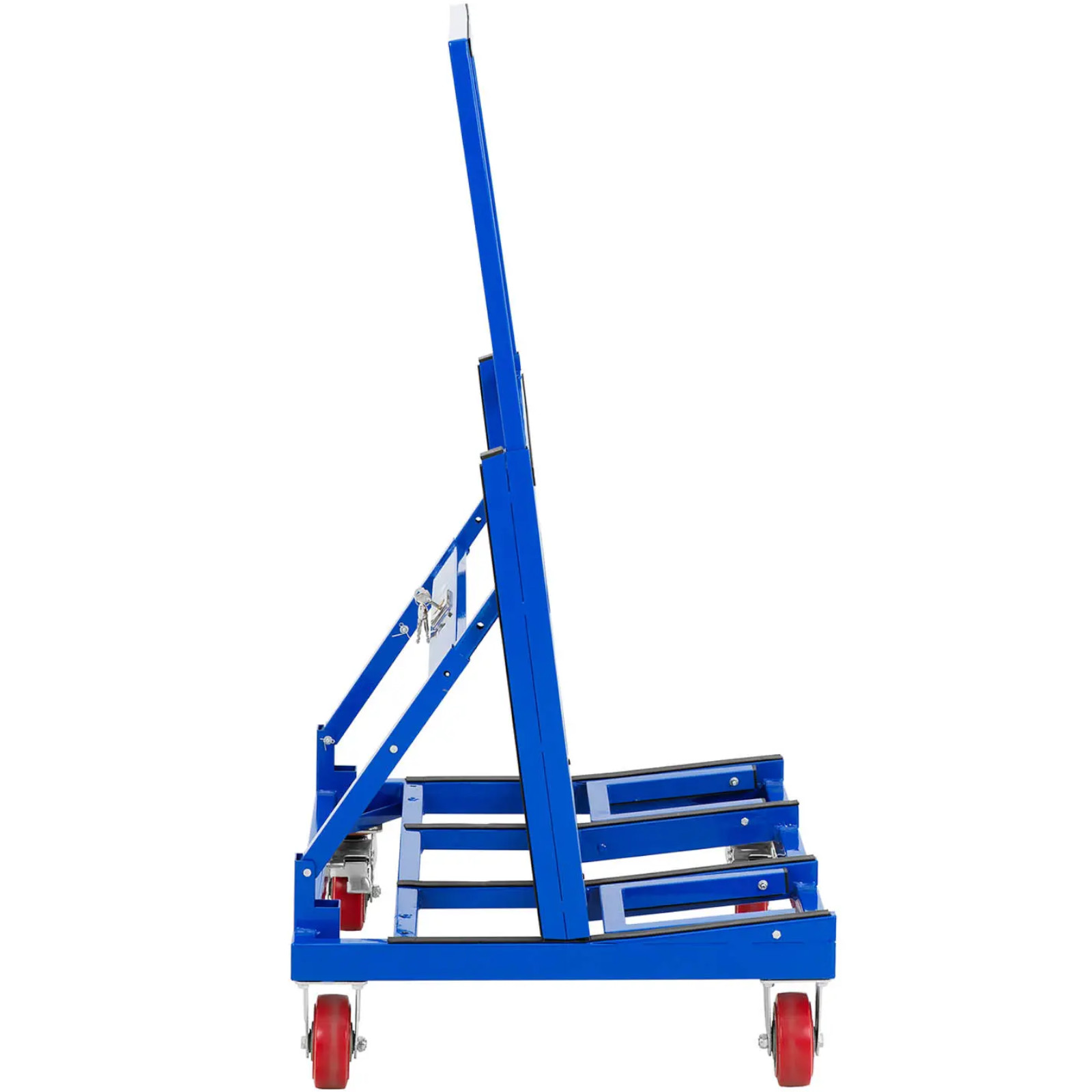 Na wózku do płyt marki MSW można wygodnie przewieźć ciężkie i nieporęczne ładunki niezależnie od tego, czy są to okna, drzwi, płyty gipsowo-kartonowe, MDF płyty drewniane. Dzięki solidnej konstrukcji wózek do transportu płyt jest idealnym wyborem na placach budowy, w warsztatach czy fabrykach. Można wykorzystać go również w firmach dostawczych. Duża przestrzeń ładunkowa bezpiecznie uniesie ciężar do 600 kg. Towar opiera się o dwie podpórki pod stabilnym i ergonomicznie ukształtowanym drążkiem do pchania. W ten sposób zapobiegnie się przypadkowemu ześlizgnięciu lub nawet spadnięciu ładunku. Wysoki uchwyt ułatwia transport wózkiem i eliminuje potrzebę korzystania z pomocy drugiej osoby przy wielu pracach. Model ten łatwo złożyć po pracy, aby zaoszczędzić miejsce. Nawet przy maksymalnym obciążeniu wózek pozostaje zwrotny i łatwy w manewrowaniu dzięki czterem lekkobieżnym kołom i otwartej ramie. Zarówno kółka skrętne, jak i dwa stałe mają średnicę 12 cm i są wykonane z tworzywa sztucznego (PVC). Dzięki temu sprzęt porusza się bardzo cicho po każdej powierzchni. Solidny wózek do płyt z powlekanej stali okaże się szczególnie trwały nawet w trudnych warunkach na placu budowy lub hali fabrycznej.