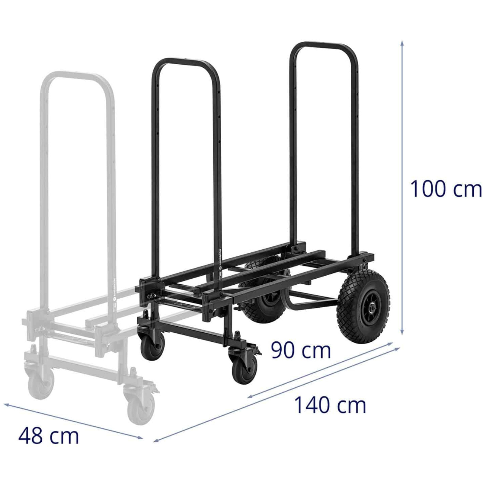 Wózek transportowy marki Singercon jest niezwykle praktyczny. Sprawdzi się podczas przeprowadzki, budowy scen, przewożenia ładunków w hotelach lub magazynie. Wysokość rączek jest regulowana w zakresie 30 – 100 cm, a po pracy można ją łatwo złożyć. Rozsuwaną powierzchnię ładunkową można dostosować do szerokiej gamy towarów w zakresie 90 – 140 cm. Pozwoli to poprawić manewrowość produktu. Łatwo przerobić go na wózek dwukołowy, platformowy lub platformę na kółkach. Wózek posiada ładowność o łącznej wadze do 350 kg, co świadczy o jego niezwykłej wytrzymałości. Konstrukcja została wykonana z żelaza, dzięki temu jest solidna i stabilna. Dwa mniejsze kółka skrętne z hamulcami i dwa większe, umożliwiają wygodny transport nawet na nierównych powierzchniach. Gdy wózek nie jest używany można do złożyć do kompaktowych rozmiarów 90 x 48 x 30 cm i schować w magazynie lub składziku, aby zaoszczędzić miejsce.