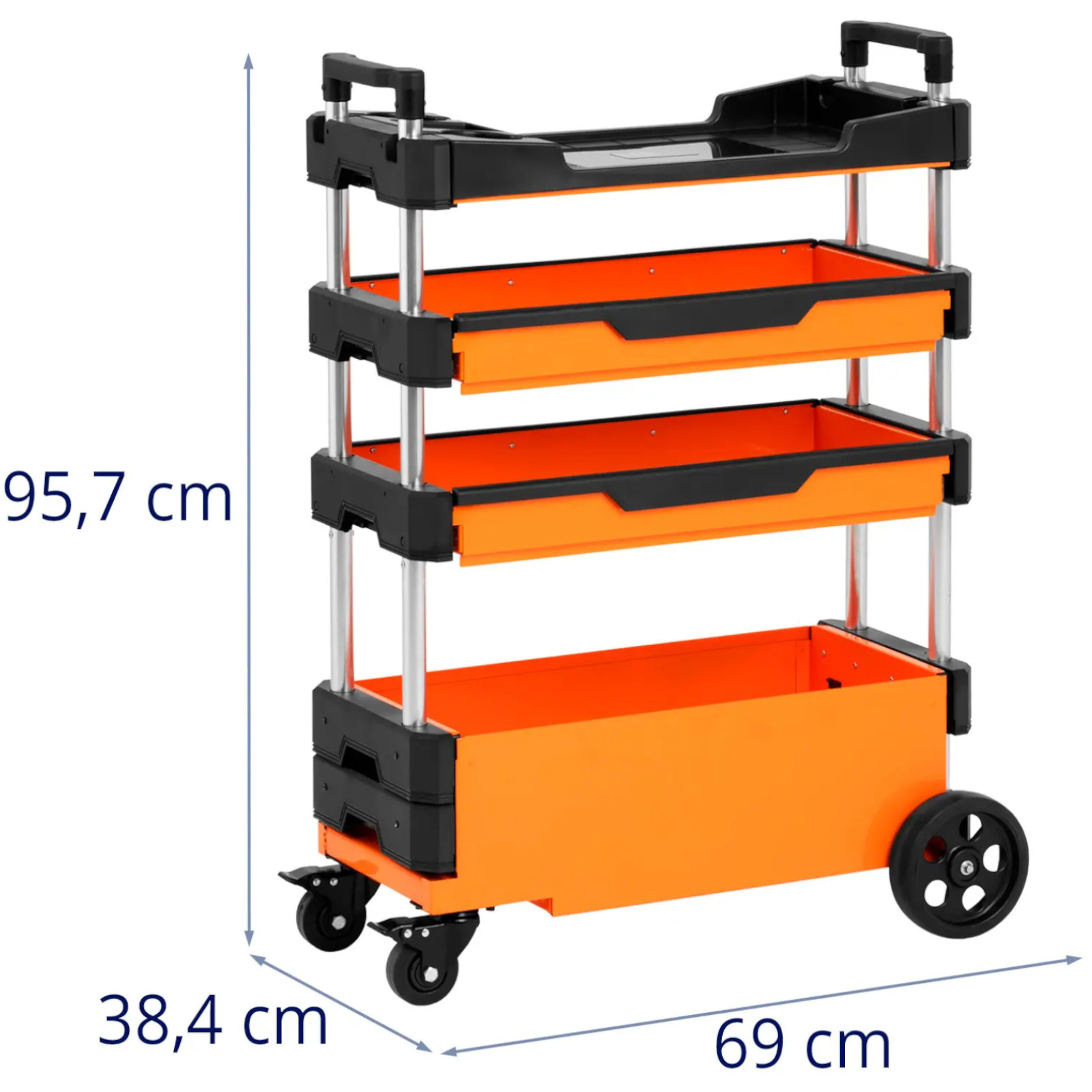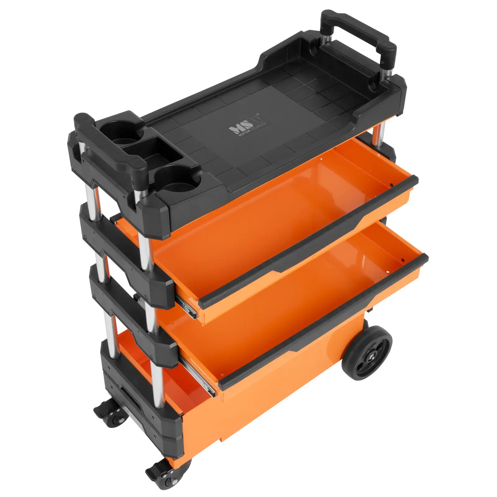 Wózek warsztatowy marki MSW oferuje dużo miejsca na przygotowanie narzędzi lub materiałów oraz ułatwia przenoszenie ich tam, gdzie są potrzebne. Przemyślany system szuflad zapewnia elastyczny dostęp do przedmiotów. Pod ręką zawsze jest wszystko co potrzebne. Stabilna konstrukcja zapewnia mnóstwo miejsca do przechowywania na czterech piętrach. Duża komora oferuje dodatkową przestrzeń. Wysokość dwóch szuflad określana jest zgodnie z potrzebami. W górnej części znajduje się praktyczna półka. Półki i przegródki wykonane są z wytrzymałego tworzywa sztucznego i są przeznaczone do pracy w trudnych warunkach, takich jak warsztaty lub hale montażowe. Wytrzymały materiał znosi także duże obciążenia. Gładkie powierzchnie wózka warsztatowego są łatwe w czyszczeniu. Cztery koła pozwalają sprawnie przestawić wózek. Dwa są stałe, dwa obrotowe i posiadają hamulce. Zapewnia to nie tylko wysoką mobilność, ale także bezpiecznie utrzymuje wózek w miejscu pracy. Duży uchwyt zapewnia niezrównaną zwrotność.