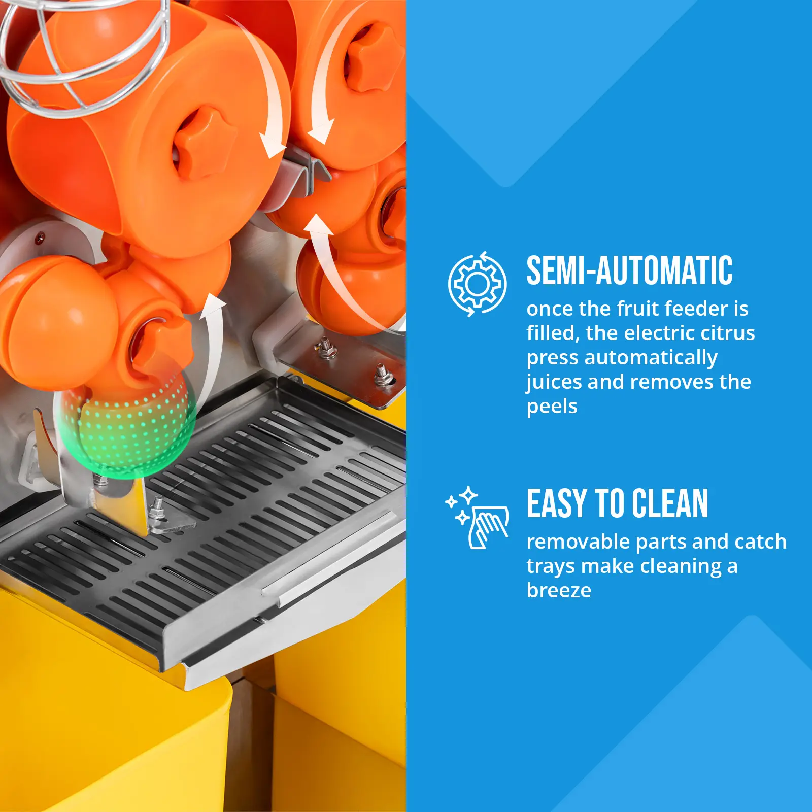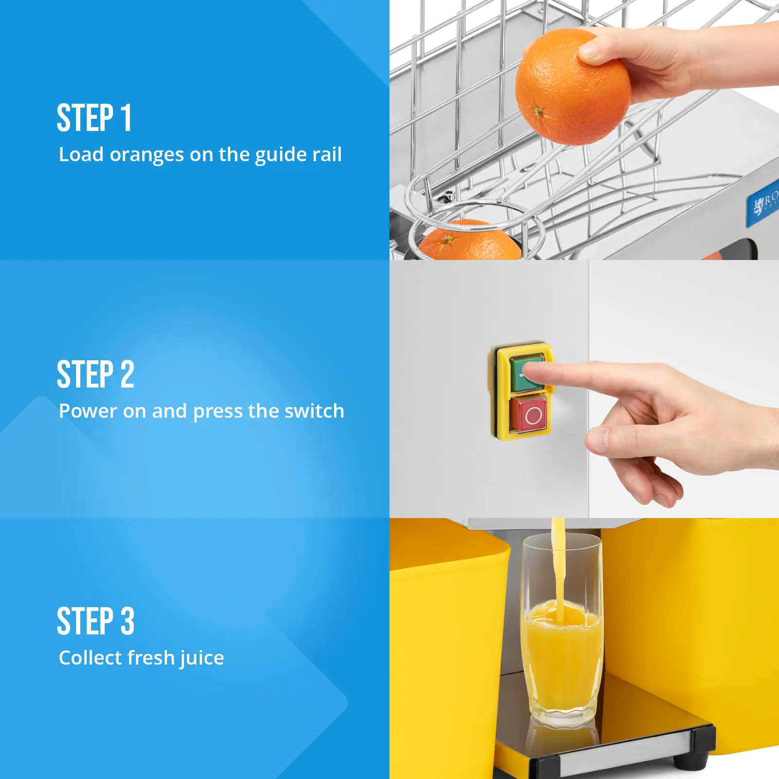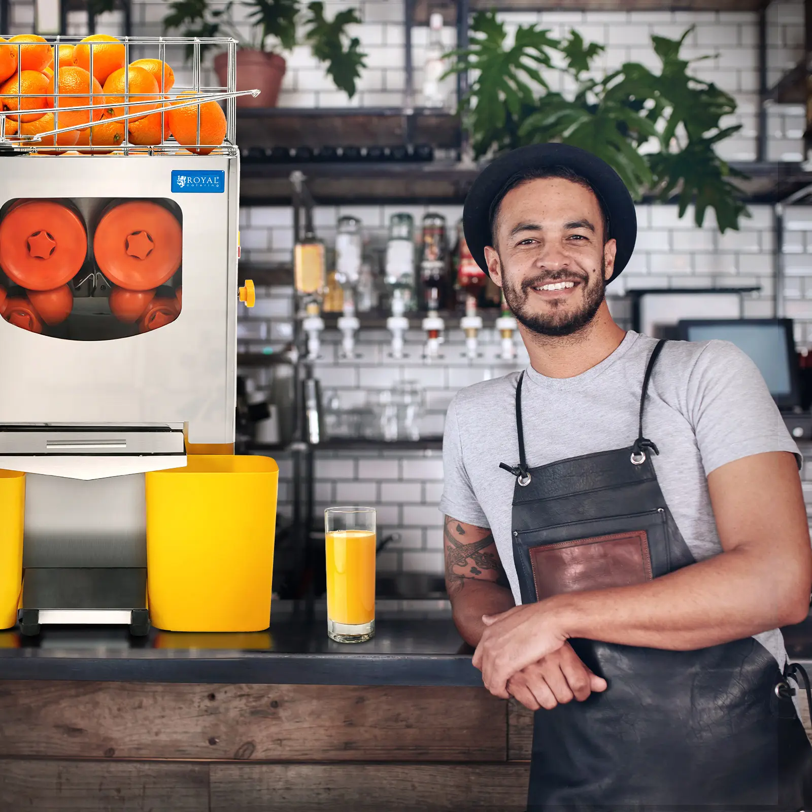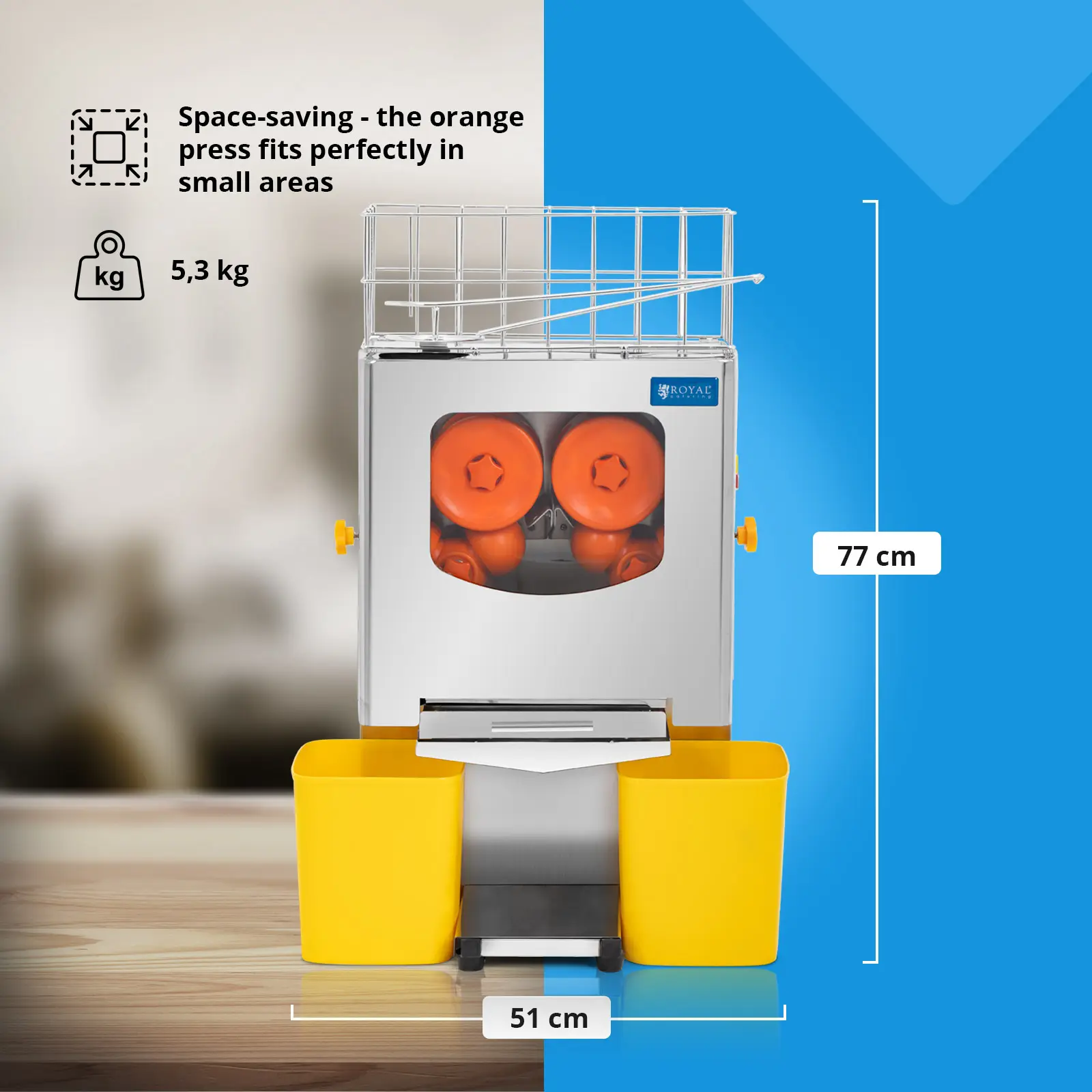 Elektryczna wyciskarka do pomarańczy marki Royal Catering sprawdzi się nawet w małych miejscach w bufecie, barze czy w restauracji. Maszyna wykona za Ciebie żmudne krojenie i wyciskanie. Wystarczy tylko wypełnić wlot owocami, a następnie wyrzucić wyciśnięte resztki z pojemników zbiorczych. Urządzenie może maksymalnie przetworzyć 20 pomarańczy na minutę. Model przeznaczony jest do pomarańczy, cytryn, mandarynek i podobnych owoców cytrusowych. Owoce można przechować w dużym koszu na urządzeniu, skąd napełnia się wlot. Aby rozpocząć wyciskanie w mechanizmie prasującym, wystarczy nacisnąć włącznik/wyłącznik odporny na zachlapanie. Podczas gdy sok w sposób ciągły spływa do naczynia pod prasą, wyciśnięte resztki owoców trafiają do dwóch umieszczonych z boku pojemników na odpady. Stożek wyciskający sprawia, że maszyna uzyskuje wyjątkowo wysoką wydajność wyciskania. Szczeliny wentylacyjne z tyłu chronią wyciskarkę przed przegrzaniem i zapewniają niezawodne działanie. Maszynę szybko i łatwo można wyczyścić pod bieżącą wodą lub w zmywarce dzięki wyjmowanym elementom i pojemnikowi zbiorczemu.