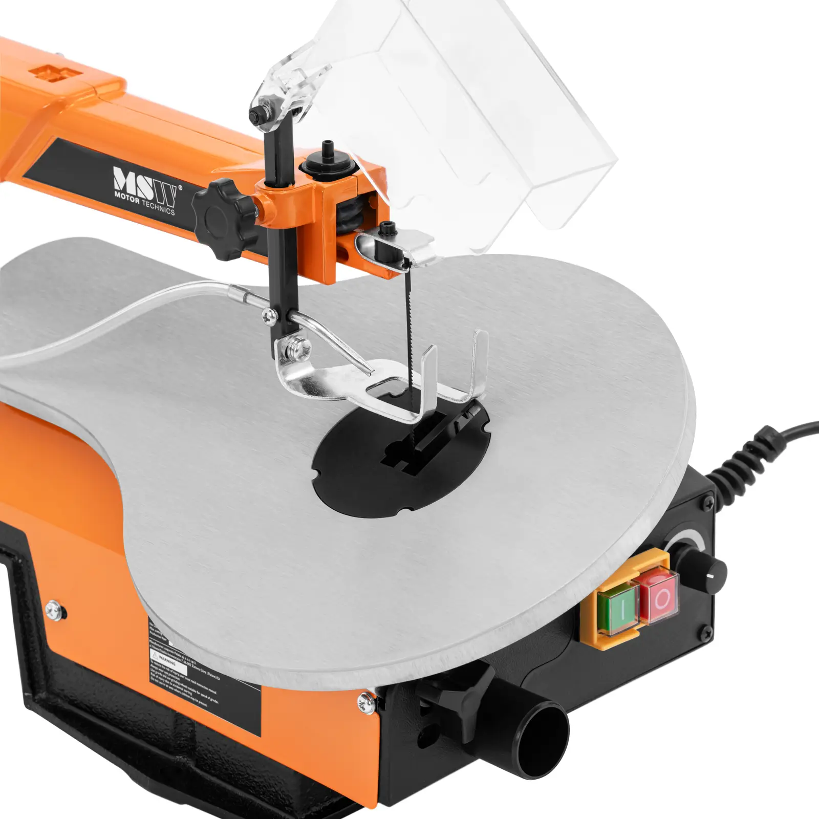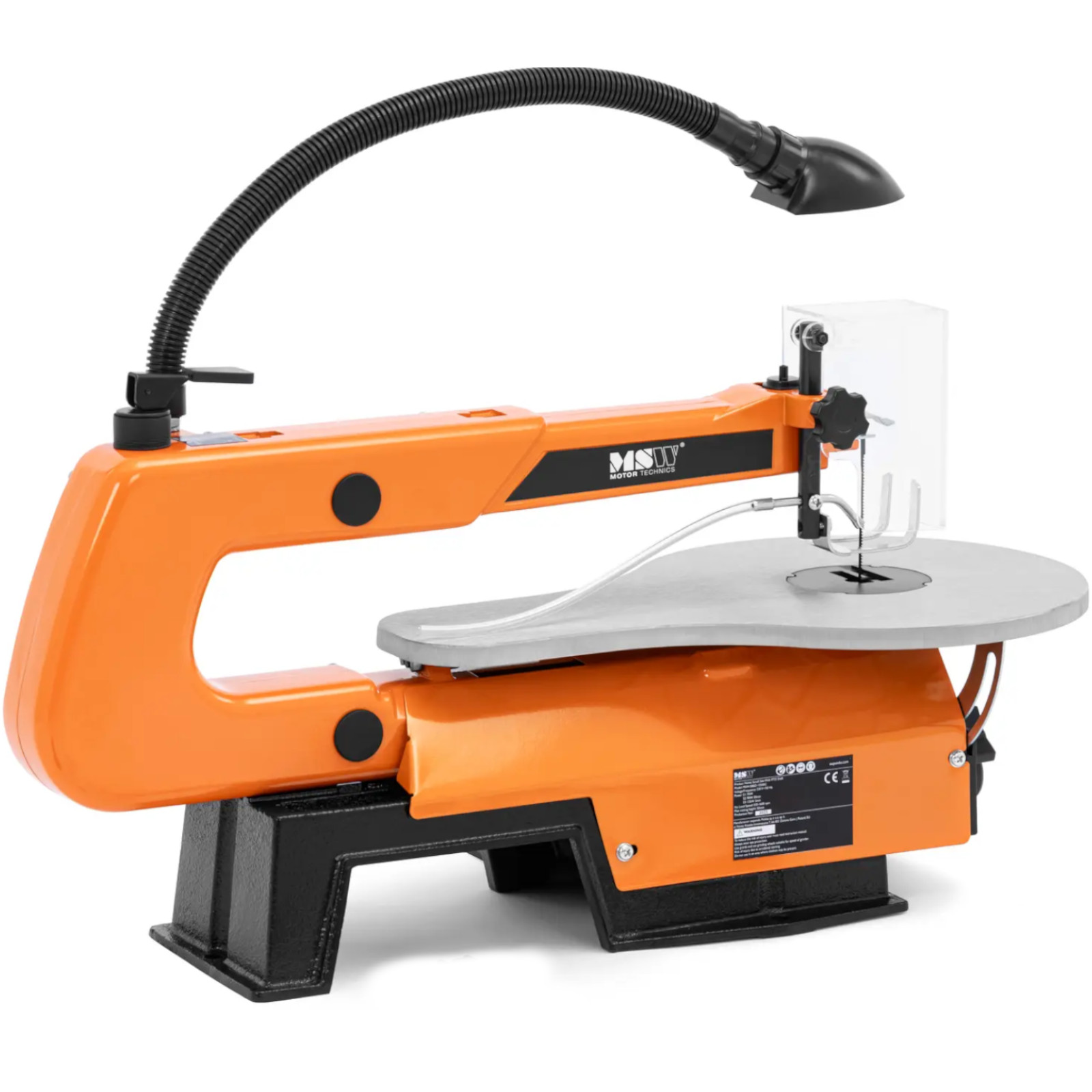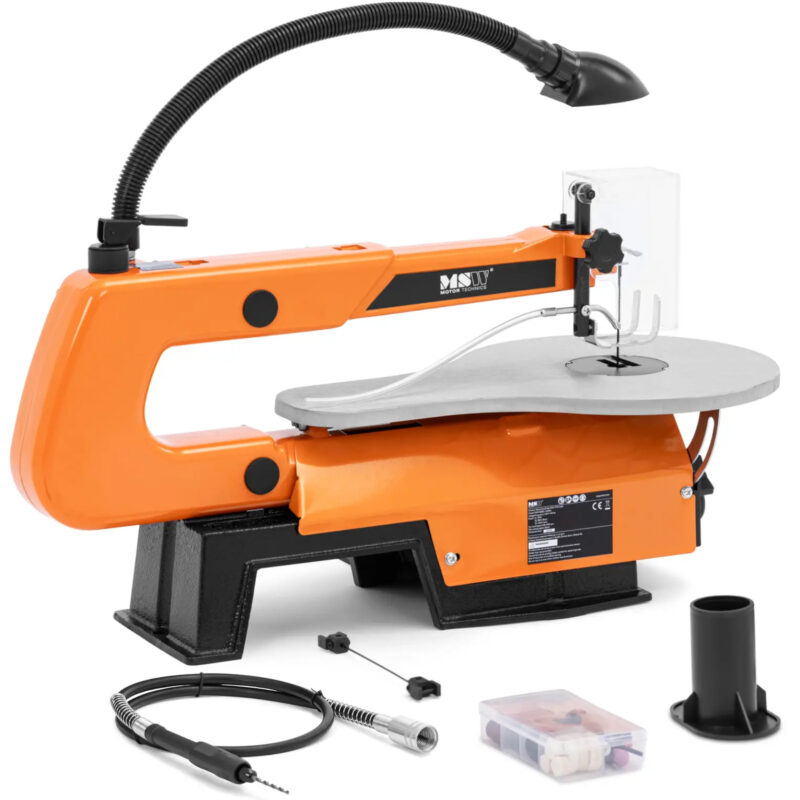 Piła włosowa marki MSW pozwala wykonać dokładne cięcia w drewnie czy plastiku. Powierzchnia robocza o wymiarach 414 x 254 mm zapewnia swobodę ruchów potrzebną do precyzyjnej pracy. Wałek giętki umożliwia dopracowanie najdrobniejszych szczegółów. Zakres od 550 do 1600 skoków na minutę pozwala piłować zarówno miękkie, jak i twarde drewno. Liczbę udarów można regulować bezstopniowo za pomocą pokrętła. Silnik ma moc 120 W. Regulowany docisk pozwala bezpiecznie przeciąć piłą obiekty o grubości do 5 cm. Aby piłować pod kątem należy za pomocą skali przechylić blat roboczy do 45°. Przy maksymalnym kącie 45° grubość cięcia zmniejsza się do 2 cm. Głębokość cięcia wynosi 406 mm. Przezroczysta osłona ochronna na brzeszczot i lampa LED, którą łatwo włączyć przy słabym oświetleniu otoczenia, zapewniają wyraźny i bezpieczny widok. Wentylator usuwa trociny i pył z powierzchni roboczej. Dzięki temu zawsze dokładnie widać przebieg pracy nawet przy skomplikowanych cięciach. Piła włosowa posiada także giętki wałek. Jest wyposażony w uchwyt wiertarski, do którego podłącza się narzędzia do szlifowania, polerowania lub cięcia. Urządzenie posiada solidną konstrukcją, która gwarantuje stabilną podstawę i pracę bez wibracji. Włącznik/wyłącznik posiada osłonę, która chroni go przed kurzem i uszkodzeniami.