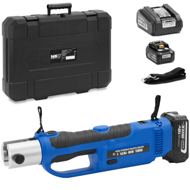 Hydrauliczna zaciskarka do rur marki MSW jest idealnym narzędziem dla zakładów elektrycznych i motoryzacyjnych oraz majsterkowiczów. Tworzy trwałe połączenia rurowe w ciągu kilku sekund. Dzięki obsłudze jedną ręką i ergonomicznemu uchwytowi wykonanie tego zadania jest nie tylko łatwiejsze, ale także znacznie szybsze niż inne metody. Praska do rur przekonuje kompaktową i ergonomiczną konstrukcją. Antypoślizgowy gumowy uchwyt i zoptymalizowany środek ciężkości zapewniają bezpieczną pracę. Dzięki mocnej lampce LED można pracować z odpowiednim oświetleniem. Na wyświetlaczu OLED z matrycą punktową można również odczytać czas zaciskania (od 3 do 4,5 s), poziom naładowania baterii lub informacje, np. przypomnienia o konserwacji i kody błędów. Zaciskarka do rur PEX jest prosta w obsłudze. Wystarczy przygotować komponenty i mocno docisnąć połączenia jedną ręką. Urządzenie pracuje z siłą do 32 kN. Praska akumulatorowa do rur automatycznie rozpoznaje maksymalne ciśnienie za pomocą mikrokomputera, cofa tłok i uwalnia zaciśnięte rury. W przypadku awarii wystarczy ręcznie zresetować tłok. Szeroki zakres zaciskania szczypiec wynosi od 12 do 54 mm dla rur ze stali nierdzewnej i od 12 do 108 mm dla rur PEX. Urządzenie idealnie nadaje się do użytku mobilnego, ponieważ jest dostarczane z odporną na wstrząsy walizką transportową, w której bezpiecznie można przechować wszystkie części. Praktyczny pasek na ramię ułatwia transport na miejsce.
