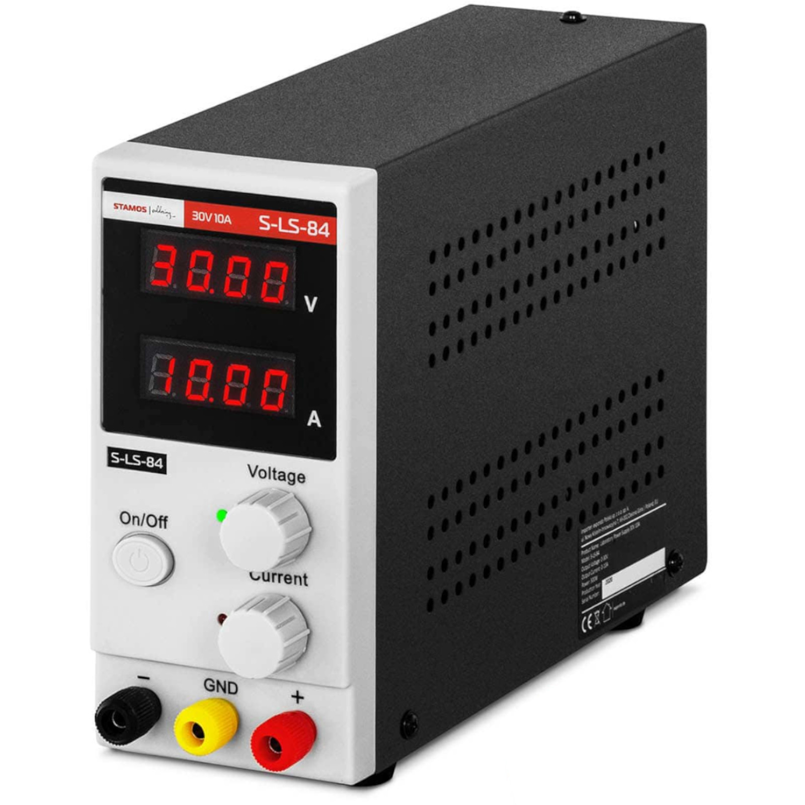 Zasilacz laboratoryjny marki Stamos Soldering sprawdzi się w zakładach produkcyjnych, przemysłowych, laboratoriach oraz instytutach badawczych a także branży telekomunikacyjnej. Służy do przetwarzania prądu zmiennego w energię elektryczną prądu stałego o określonym napięciu oraz dostarczania go do elektronicznych urządzeń zewnętrznych. Zasilacz wyposażono w jeden kanał. Umożliwia on precyzyjną regulację napięcia w zakresie 0-30 V i prądu wyjściowego 0-10 A. Regulacja parametrów odbywa się za pomocą pokręteł. Moc urządzenia wynosi 300 W. Wyświetlacz LED pozwala wygodnie odczytać wartości prądu i napięcia wyjściowego. Urządzenie posiada tryb stabilizacji prądu wyjściowego (CC) i stabilizacji napięcia (CV). Został także wyposażony w zabezpieczenie termiczne (OTP) i przeciążeniowe (OPP). Wentylator zapewnia optymalną temperaturę sprzętu. Gumowe nóżki zapobiegają ślizganiu się i nie rysują powierzchni.