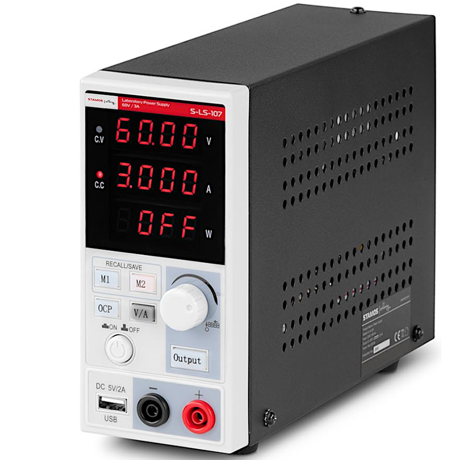 Zasilacz laboratoryjny marki STAMOS to profesjonalne urządzenie do indywidualnego zasilania prądem stałym różnych urządzeń i wyposażenia zewnętrznego. Duży wyświetlacz LED pozwala na stałe kontrolowanie ustawionych wartości, widoczne są nawet w złych warunkach oświetleniowych. Dodatkowo poszczególne wartości opatrzone są odpowiednimi skrótami jednostek, co pozwala na odróżnienie natężenia prądu od napięcia. Urządzenie ma wbudowany port USB, który posłuży jako dodatkowe źródło zasilania o napięciu 5 V / 2 A, natomiast z tyłu zasilacza znajduje się port USB-B służący do wymiany danych. Za pomocą pokręteł można indywidualnie ustawić napięcie wyjściowe 0-60 V oraz natężenie prądu wyjściowego 0-3 A. Jeżeli zasilacz pracuje jako źródło napięcia stałego (CV), urządzenie automatycznie przełącza się na pracę ze stałym prądem (CA) po osiągnięciu ustawionego limitu obciążenia. Zasilacz laboratoryjny został wyposażony w zabezpieczenia przeciążeniowe (OPP), nadprądowe (OCP) i chroniące przed przegrzaniem (OTP), które automatycznie uruchamia zintegrowany wentylator zaraz po przekroczeniu maksymalnej temperatury. Taki system ochronny gwarantuje bezpieczną pracę zasilacza, nawet przy intensywnym i długotrwałym użytkowaniu.