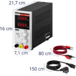 Zasilacz laboratoryjny marki Stamos Soldering sprawdzi się w przemyśle, laboratoriach, telekomunikacji, warsztatach itp. Zastosowana technologia zapewnia niski poziom tętnień i szumów. Duże wyświetlacze LED pozwalają w każdej chwili bez problemu odczytać ustawione wartości. Regulacja ustawień następuje poprzez pokrętła. Umożliwiają one dokładne ustawienie napięcia wyjściowego od 0 do 100 V oraz prądu wyjściowego od 0 do 3 A. Jeśli zasilacz pracuje jako źródło stałego napięcia (CV), automatycznie przełącza się na pracę ze stałym prądem (CA) po osiągnięciu ustawionego limitu obciążenia. Zapobiega to uszkodzeniu podłączonych urządzeń. Sprzęt wyposażono w zabezpieczenie przeciążeniowe (OPP) oraz zabezpieczenie przed przegrzaniem (OTP), które automatycznie uruchamia wentylator po przekroczeniu maksymalnej temperatury. Antypoślizgowe gumowe nóżki zapewniają stabilność urządzenia i chronią powierzchnię przed zarysowaniami.