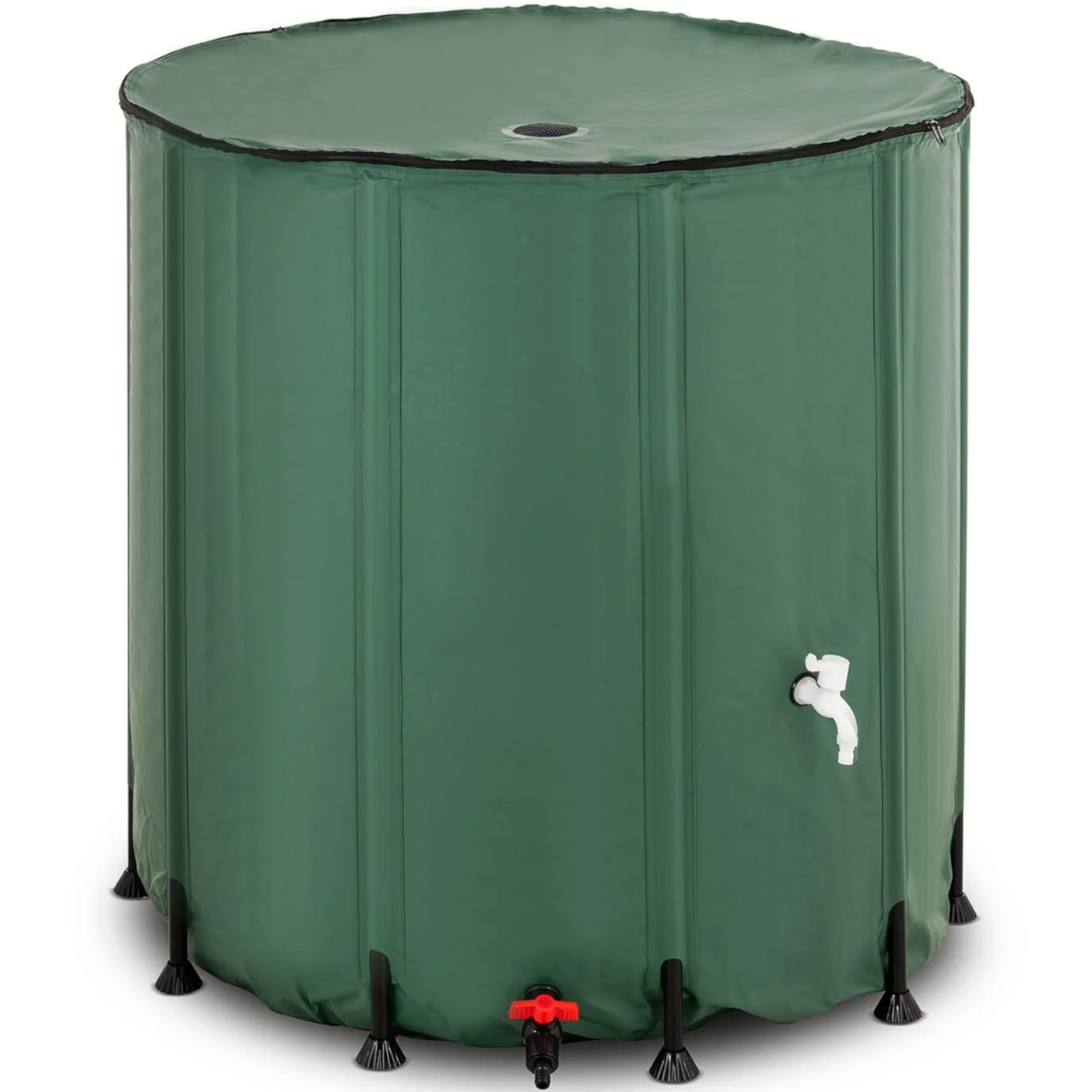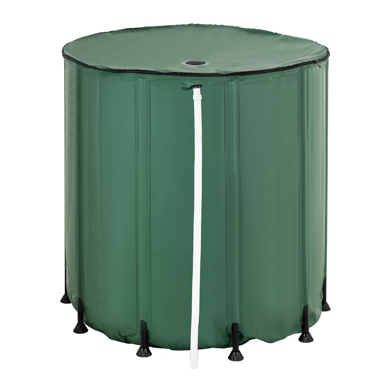 Zbiornik na deszczówkę marki Hillvert posiada pojemność do 750 l. Sprawdzi się podczas biwakowania lub na działce. Beczka ustawiana jest w mgnieniu oka. Pokrywę z odpornego na rozerwanie PVC naciąga się za pomocą plastikowych prętów, które zapewniają stabilność pojemnika. Aby uzyskać optymalną stabilność, należy przymocować stopki pod słupkami. W pokrywie znajduje się otwór, przez który można odprowadzać wodę deszczową do wnętrza. Dzięki filtrowi siatkowemu do środka nie dostają się zanieczyszczenia ani liście. Aby optymalnie zarządzać wodą pojemnik na deszczówkę oferuje trzy odpływy z filtrami utrzymującymi czystość wody. Za pomocą kranu z łatwością napełnia się konewkę wodą. Kurek spustowy na dole ma przyłącze 3/4″, które można wykorzystać do węża ogrodowego. Kurek przelewowy chroni beczkę na deszczówkę podczas ulewnego deszczu. Wszystkie materiały są niezwykle trwałe i przeznaczone do użytku na zewnątrz. Pokrowiec z PVC wykonano z tkaniny 500D i jest on odporny na promieniowanie UV. Jednocześnie niezwykle elastyczny materiał można złożyć do minimalnego rozmiaru na czas transportu.