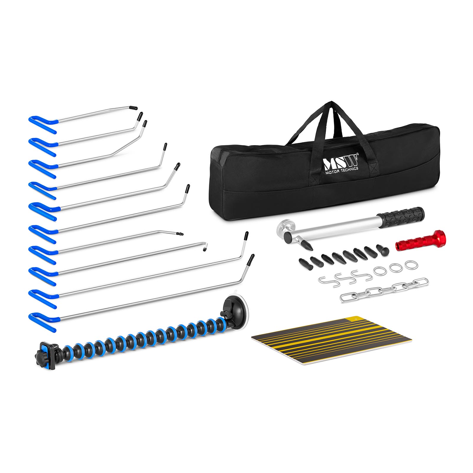 Kompletny zestaw akcesoriów zawiera wszystkie elementy niezbędne do usunięcia małych, średnich oraz dużych wgnieceń o różnych kształtach. Zakres dostawy obejmuje aż 21 przedmiotów, w tym deskę refleksyjną do identyfikacji wgnieceń, podbijak z wymiennymi końcówkami, młotek blacharski, pręty PDR (10 sztuk) i wiele innych akcesoriów specjalistycznych.