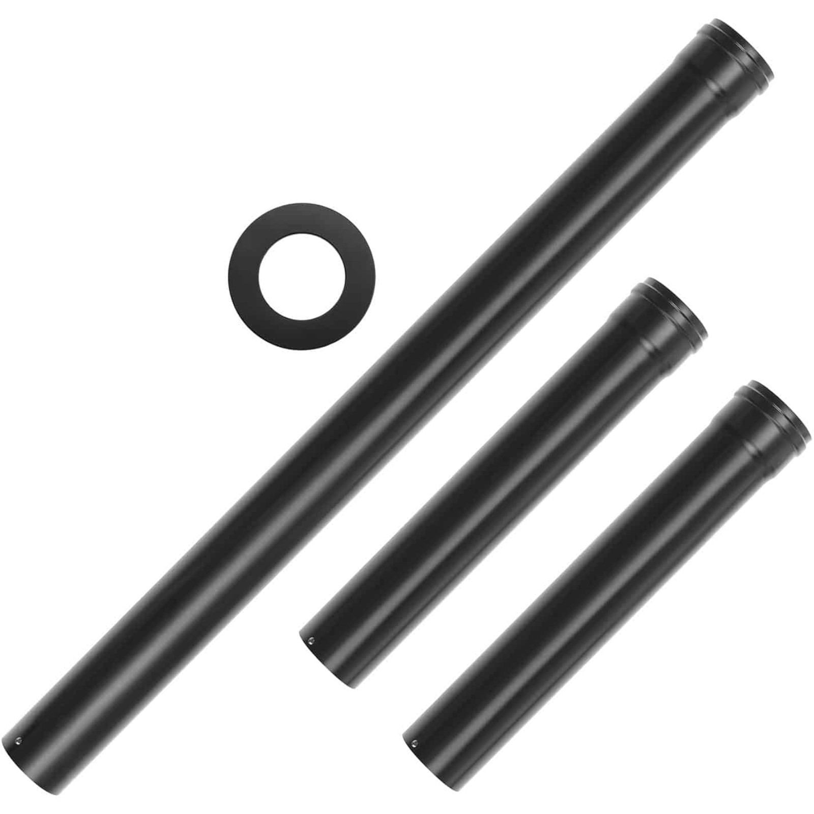 - – Zestaw z 3 rurami (100 cm + 2 x 50 cm), trójnikiem z osłoną, 2 kolankami (45° + 90°), rozetą, – zaślepką przeciwwiatrową, podkładką i silikonowymi uszczelkami,