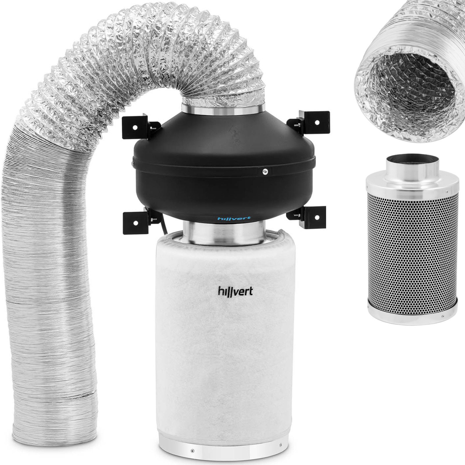Zestaw wentylacyjny marki Hilvert składa się z produktów o numerach: 10090318, 10090330 i 10090328. Wentylator kanałowy jest cichy, bardzo wydajny i niezawodnie wyciąga do 382,2 m3 powietrza na godzinę. Urządzenie pracuje przy stałym ciśnieniu i z mocą 65 W. Posiada wylot o średnicy 124 mm. Prędkość przepływu wynosi 8,8 m/s Rura wentylacyjna jest łatwo rozciągalna do 1000 cm, Spirala jest obustronnie pokryta aluminium, co sprawia że rura jest odporna na korozję, niezawodnie odprowadza parę wodną oraz zużyte powietrze. Rura jest bardzo elastyczna, jej średnica wynosi 125 mm. Filtr z węglem aktywnym wiąże wszelkiego rodzaju niepożądane cząsteczki, niezależnie czy chodzi o dym, opary, benzynę, chemikalia, pestycydy czy zapachy zwierząt. Powierzchnia porowata działa jak gąbka, wiążąc każdą formę cząstek. Wyposażony jest w kołnierz przyłączeniowy o średnicy 130 mm. Średnica zewnętrzna wynosi 20 cm.