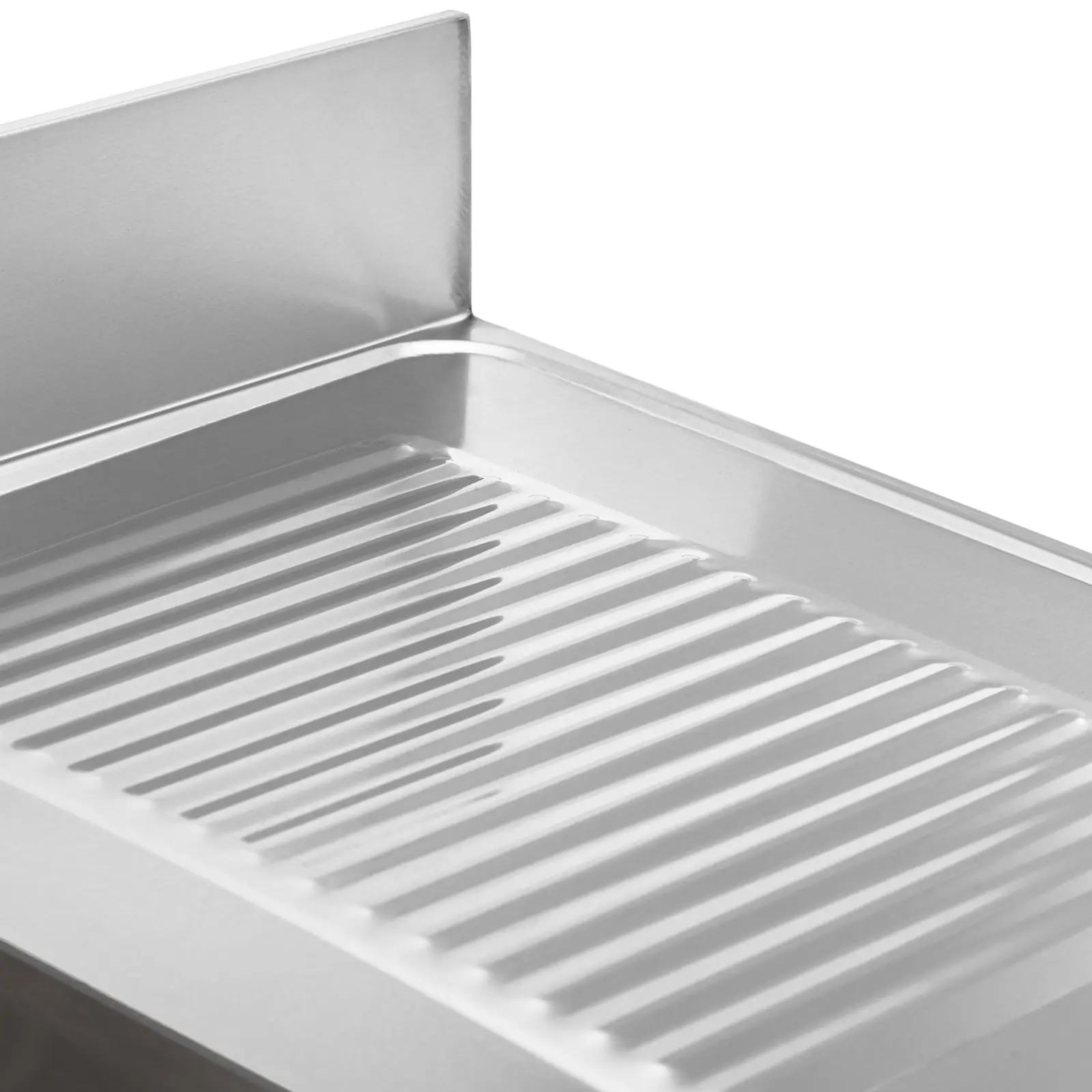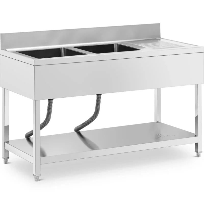 Zlew gastronomiczny marki Royal Catering to idealne rozwiązanie do kuchni komercyjnych, restauracji i podobnych obiektów, a także laboratoriów. Kompaktowy stół gastronomiczny ma dwa wyjątkowo pojemne zlewy, w których z łatwością można pomieścić duże i nieporęczne garnki, patelnie lub ruszty grillowe. Każda umywalka ma wymiary 400 x 400 x 250 mm, obok nich znajduje się ociekacz do suszenia umytych naczynia. Ponadto praktyczny rant o wysokości 120 mm ochroni płytki i ściany z tyłu przed zachlapaniem wodą. Zlew wykonany jest w całości z wytrzymałej stali nierdzewnej. Mocny materiał jest trwały, wysoce odporny na korozję i zachowuje swój połysk przez długi czas. Dzięki ponadczasowemu wzornictwu pasuje do każdej kuchni. Sprzęty ze stali nierdzewnej są również szybkie i łatwe w czyszczeniu. Nóżki są regulowane w zakresie 50