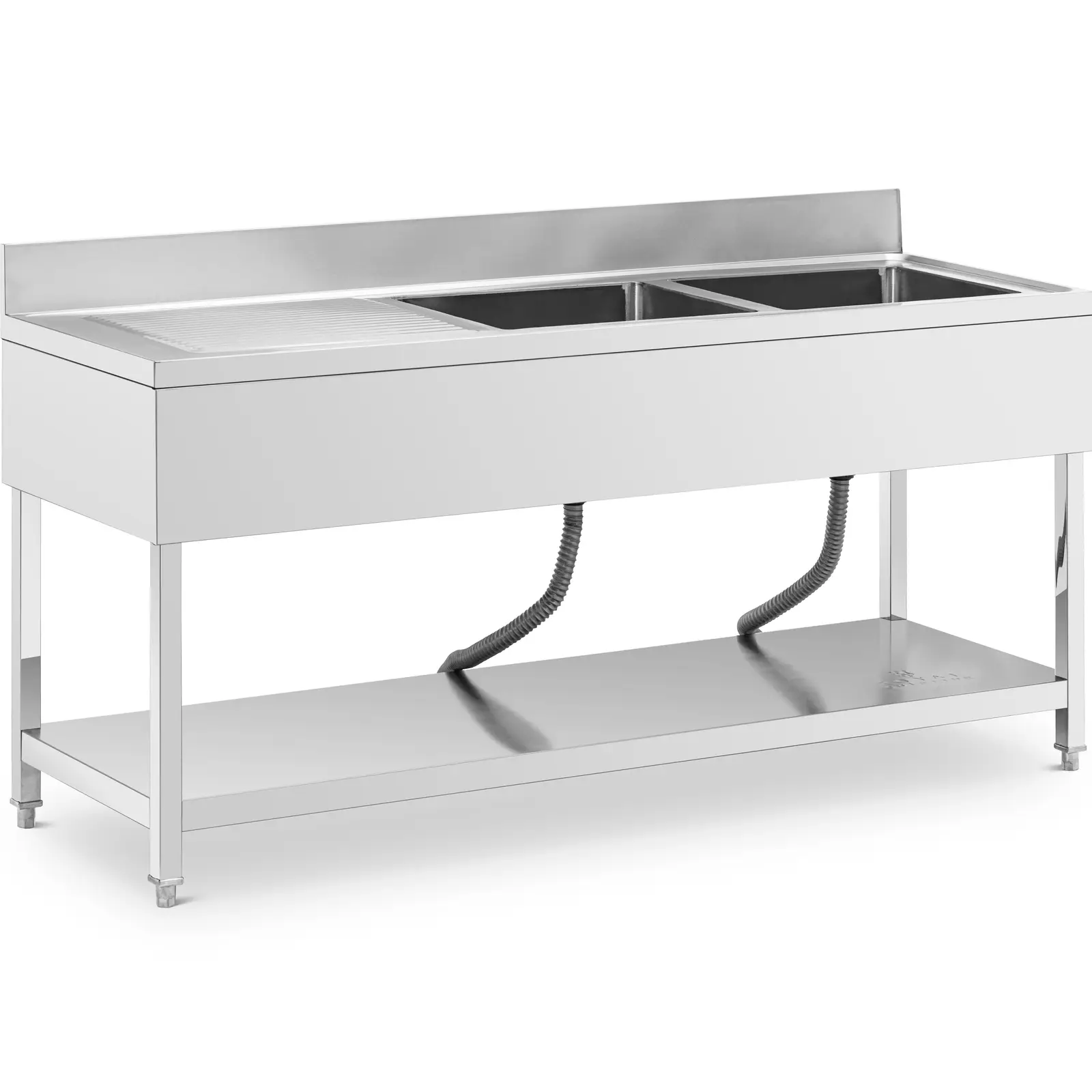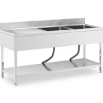 Zlew marki Royal Catering to idealne rozwiązanie do kuchni komercyjnych, restauracji i podobnych obiektów, a także laboratoriów. Kompaktowy stół ma dwa wyjątkowo pojemne zlewy, do pomieszczenia dużych i nieporęcznych garnków, patelni lub rusztów grillowych. Obok umywalek o wymiarach 500 x 400 x 250 mm każda znajduje się ociekacz do suszenia umytych naczynia. Ponadto praktyczny rant o wysokości 120 mm ochroni ścianę przed zachlapaniem. Zlew wykonany został w całości z wytrzymałej stali nierdzewnej. Jest trwały, odporny na korozję i zachowuje połysk przez długi czas. Dzięki ponadczasowemu wzornictwu pasuje do każdej kuchni. Sprzęty ze stali nierdzewnej są również szybkie i łatwe w czyszczeniu. Nóżki są regulowane w zakresie 50 mm aby zachować stabilność nawet na nierównej podłodze.