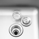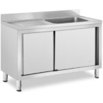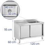 Zlew jednokomorowy o wymiarach 500 x 400 x 260 mm umieszczony został po prawej stronie szafki. Doskonale nadaje się do mycia głębokich garnków czy blach do pieczenia. Wysokie ścianki chronią przed zachlapaniem otoczenia. W odpływie umieszczono sitko, zapobiegające zatkaniu rur resztkami. Gładkie powierzchnie zapewniają łatwe utrzymanie w czystości. Zaokrąglone krawędzie szafki gwarantują bezpieczeństwo użytkowania. Rant o wysokości 100 mm chroni ścianę za meblem przez zabrudzeniem. Pod zlewem umieszczono dużą szafkę z przesuwnymi drzwiami, mieszczącą najpotrzebniejsze narzędzia kuchenne. Wysokość nóżek jest regulowana.