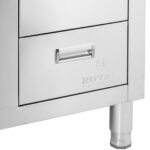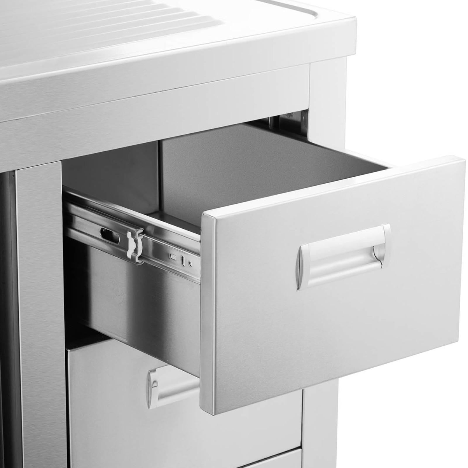 Zlew jednokomorowy o wymiarach 400 x 400 x 300 mm umieszczony został po lewej stronie szafki. Doskonale nadaje się do mycia głębokich garnków czy blach do pieczenia. Wysokie ścianki chronią przed zachlapaniem otoczenia. W odpływie umieszczono sitko, zapobiegające zatkaniu rur resztkami. Gładkie powierzchnie zapewniają łatwe utrzymanie w czystości. Zaokrąglone krawędzie szafki gwarantują bezpieczeństwo użytkowania. Rant o wysokości 100 mm chroni ścianę za meblem przez zabrudzeniem. Pod zlewem umieszczono dużą szafkę z przesuwnymi drzwiami, mieszczącą najpotrzebniejsze narzędzia kuchenne. Wysokość nóżek jest regulowana.