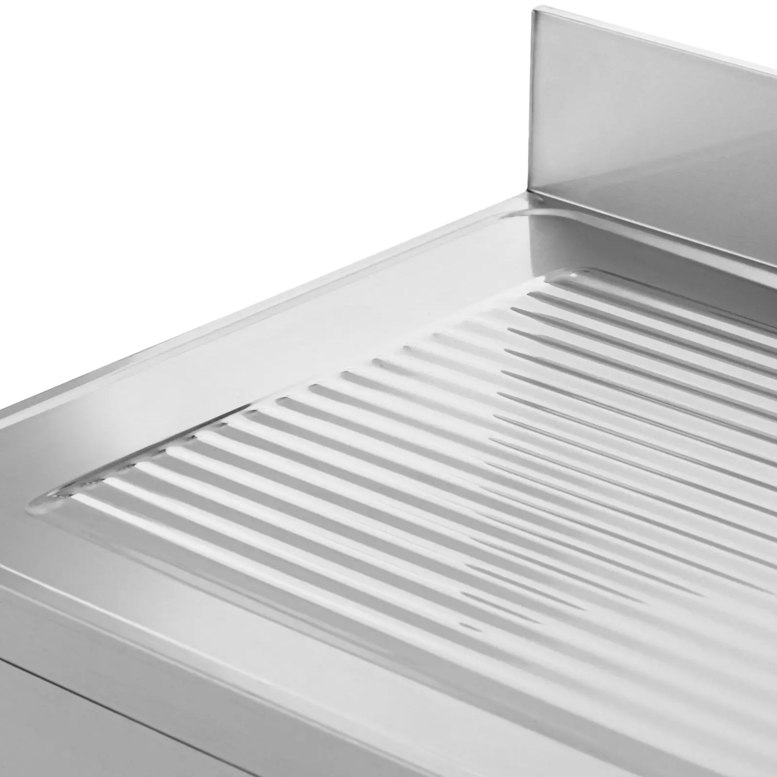 Zlew gastronomiczny marki Royal Catering to idealne rozwiązanie do kuchni komercyjnych, restauracji i podobnych obiektów, a także laboratoriów. Stół wyposażono w wyjątkowo pojemny zlew, który pomieści duże i nieporęczne garnki, patelnie lub ruszty grillowe. Obok umywalki o wymiarach 400 x 400 x 250 mm znajduje się ociekacz do suszenia umytych naczynia. Rant o wysokości 120 mm chroni płytki i ściany z tyłu przed zachlapaniem wodą. Zlew wykonano w całości ze stali nierdzewnej, która jest trwała, odporna na korozję, zachowuje swój połysk przez długi czas oraz łatwo się czyści. Ponadczasowe wzornictwo pasuje do każdej kuchni. Nóżki są regulowane w zakresie 50 mm co pozwala na dobre ustawienie mebla nawet na nierównej powierzchni.