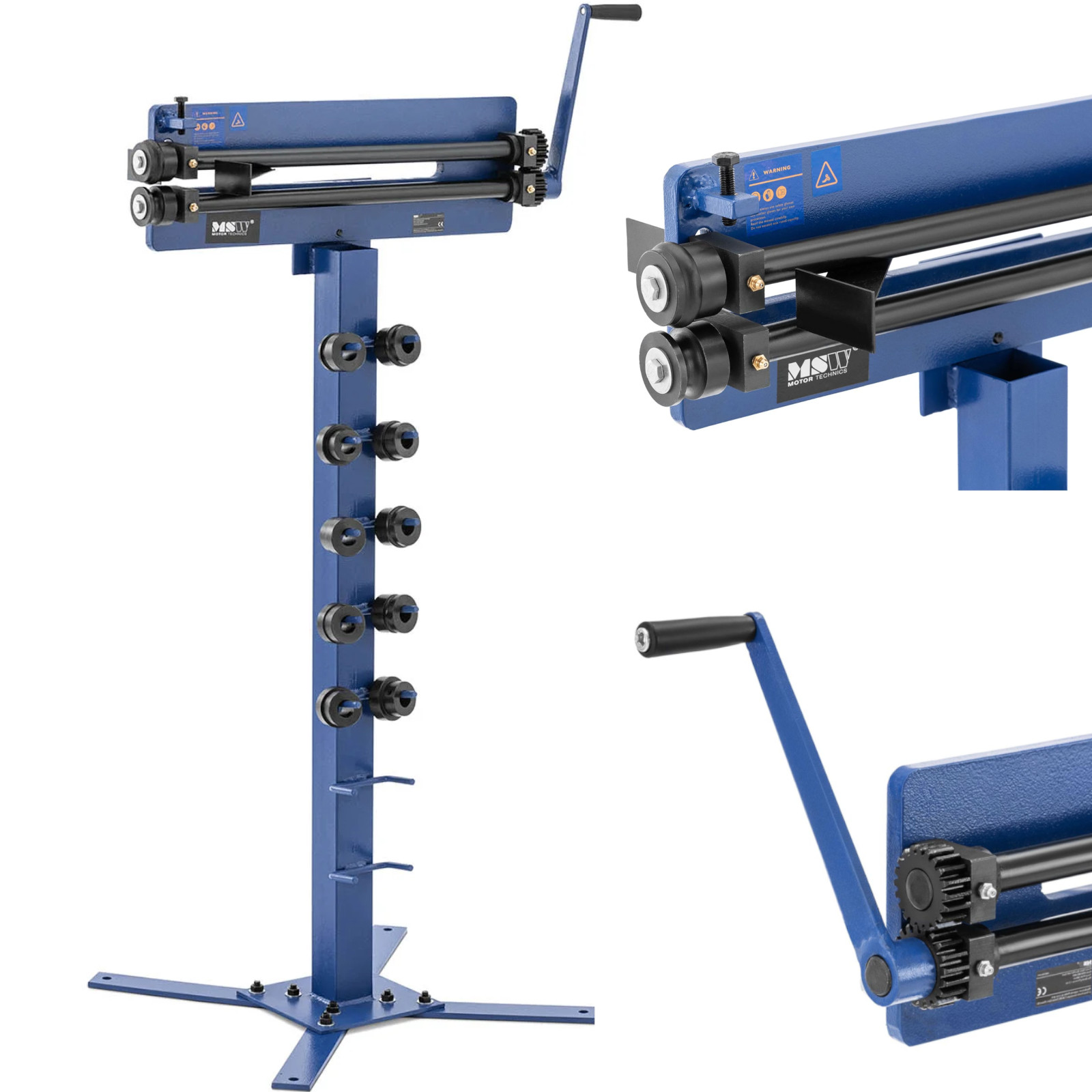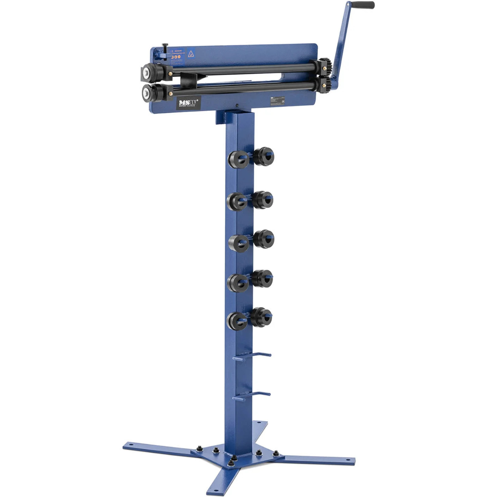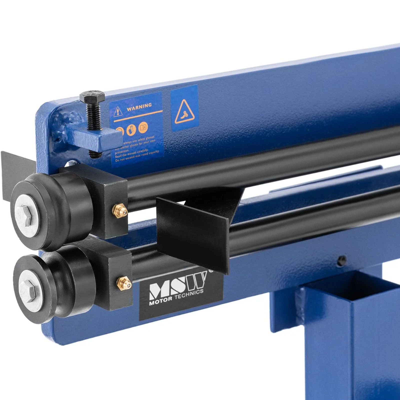 Żłobiarka marki MSW pozwoli z łatwością i precyzją obrabiać blachy o grubości do 1,2 mm. W tym celu należy wyposażyć górny uchwyt rolki w jedną z trzech form, a dolną w odpowiednią matrycę. Za pomocą korby można wyciągnąć blachę. Do typowych zastosowań zakres dostawy obejmuje trzy pary rolek kołnierzowych (1,5 mm, 3 mm, 6 mm) i trzy pary rolek kulkowych (4 mm, 6 mm, 7,5 mm). Żłobiarka działa mechanicznie za pomocą korby. Ruch nią napędza dwa uchwyty z szerokością podawania 460 mm. Ruch obrotowy wciąga blachy do żłobiarki ręcznej i jednocześnie odkształca je w pożądany sposób. Dzięki dużej długości potrzeba tylko niewielkiej siły mięśni, aby przetworzyć dużą liczbę arkuszy bez zmęczenia. Zintegrowany stojak oferuje uchwyty dla wszystkich 6 par rolek profilowych, dzięki czemu są zawsze pod ręką. Ponadto stojak łatwo przymocować do podłogi za pomocą wgłębień w podstawie. Żłobiarka oraz podstawa wykonane są z wyjątkowo wytrzymałej stali lakierowanej na niebiesko. Idealnie sprawdza się w warunkach do obróbki metalu i zastosowaniu w warsztatach.