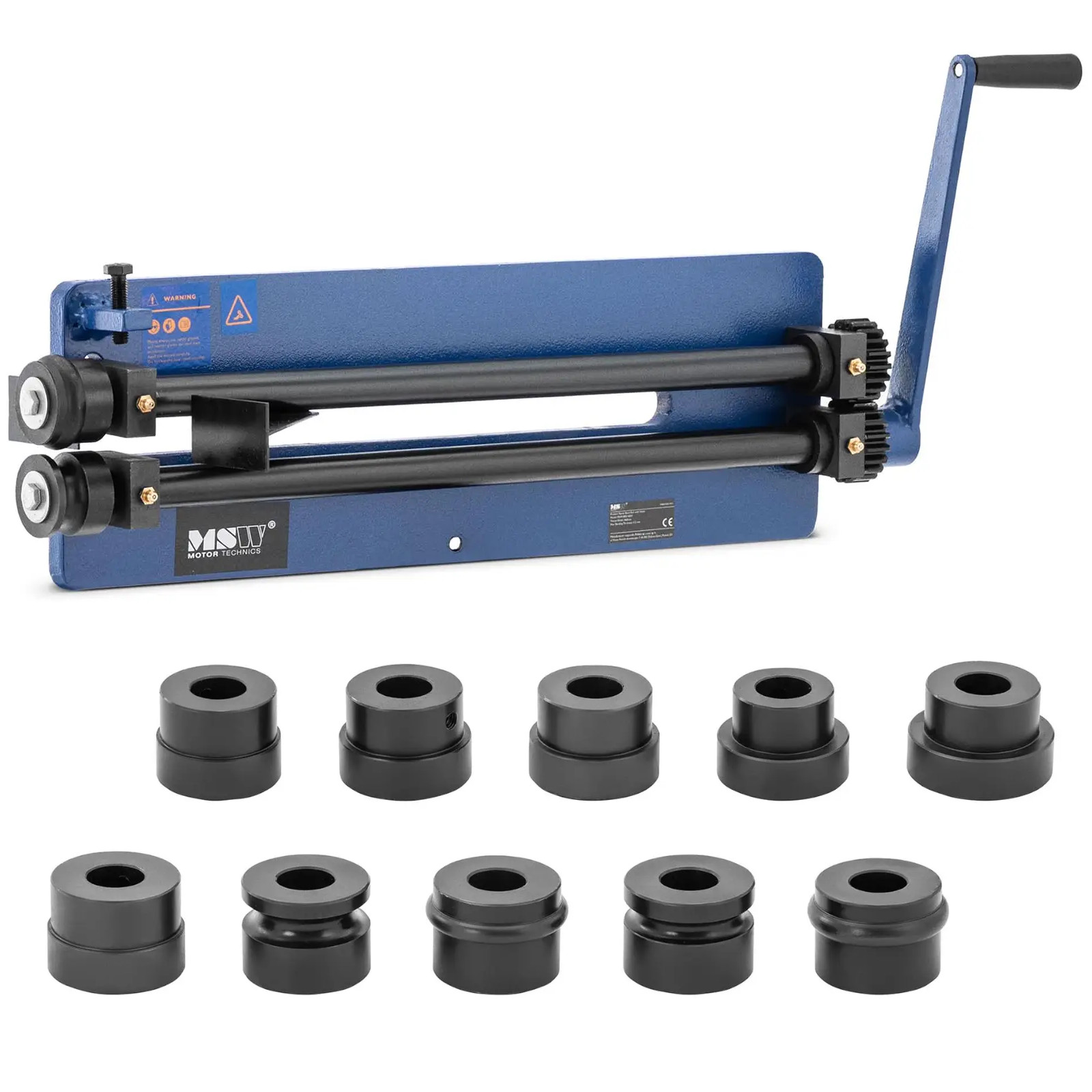 Żłobiarka marki MSW pozwala z łatwością i precyzją obrabiać blachy o grubości do 1,2 mm. W tym celu należy wyposażyć górny uchwyt rolki w jedną z trzech form, a dolną w odpowiednią matrycę. Za pomocą korby należy wciągnąć blachę. Do typowych zastosowań zakres dostawy obejmuje trzy pary rolek kołnierzowych (1,5 mm, 3 mm, 6 mm) i trzy pary rolek kulkowych (4 mm, 6 mm, 7,5 mm). Żłobiarka działa mechanicznie za pomocą korby. Ruch nią napędza dwa uchwyty z szerokością podawania 460 mm. Ruch obrotowy wciąga blachy do żłobiarki ręcznej i jednocześnie odkształca je w pożądany sposób. Dzięki dużej długości potrzeba tylko niewielkiej siły mięśni. Maszyna przetwarza dużą liczbę arkuszy bez zmęczenia. Żłobiarkę wykonano ze stali chromowanej. Materiał jest bardzo odporny na rdzę, a jednocześnie wyjątkowo wytrzymały. Idealnie sprawdza się w warunkach do obróbki metalu i zastosowaniu w warsztatach oraz na budowach. Aby ułatwić obsługę, żłobiarkę do blachy można łatwo zamontować na dowolnym stole warsztatowym dzięki odpowiednim wycięciom.